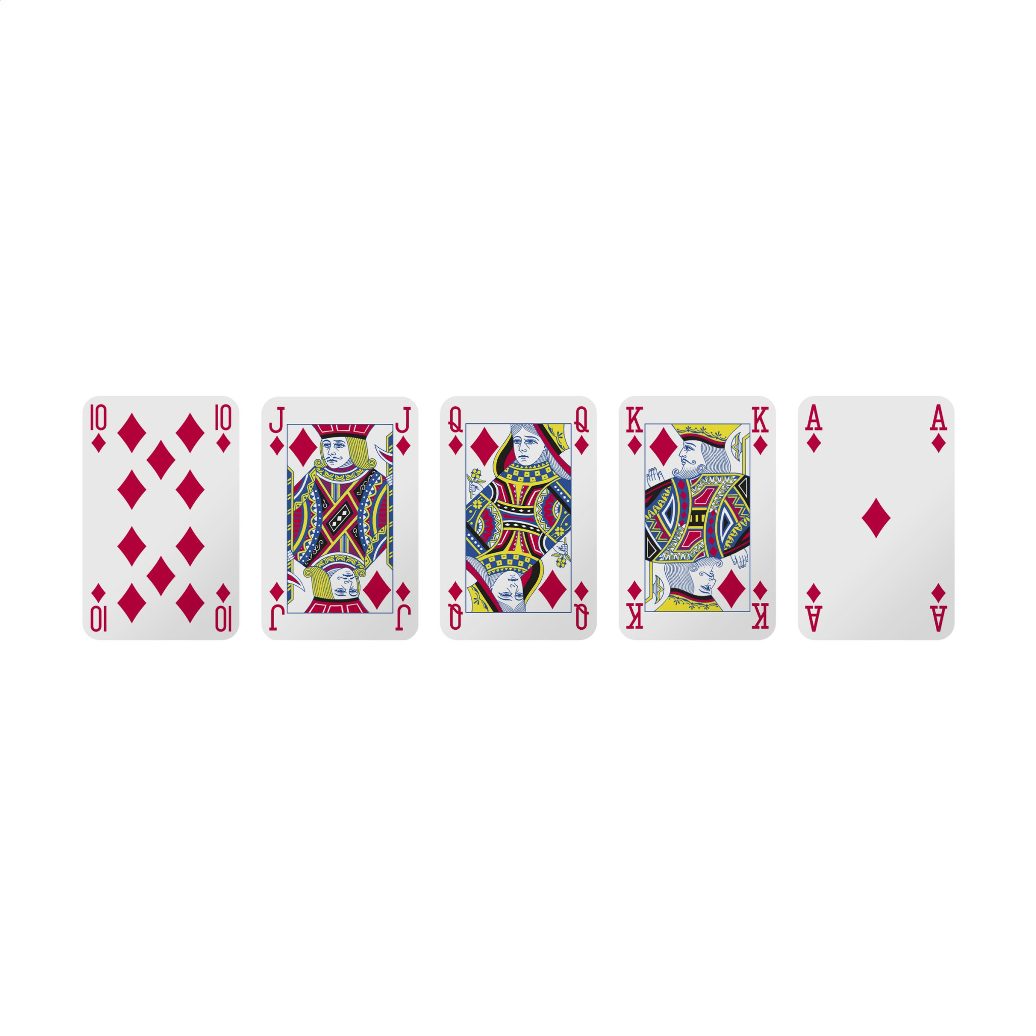 Tugevast 300-grammisest papist mängukaardid. Need pakid koosnevad 52 mängukaardist ja 2 jokkerist. Pakendatud tsellofaaniga pappkarpi. Saate lisada oma täisvärvilise kujunduse kaartide tagaküljele ja ka karbile, luues ainulaadse, isikupärastatud kaardipaki, mis reklaamib teie kaubamärki igas mängus.