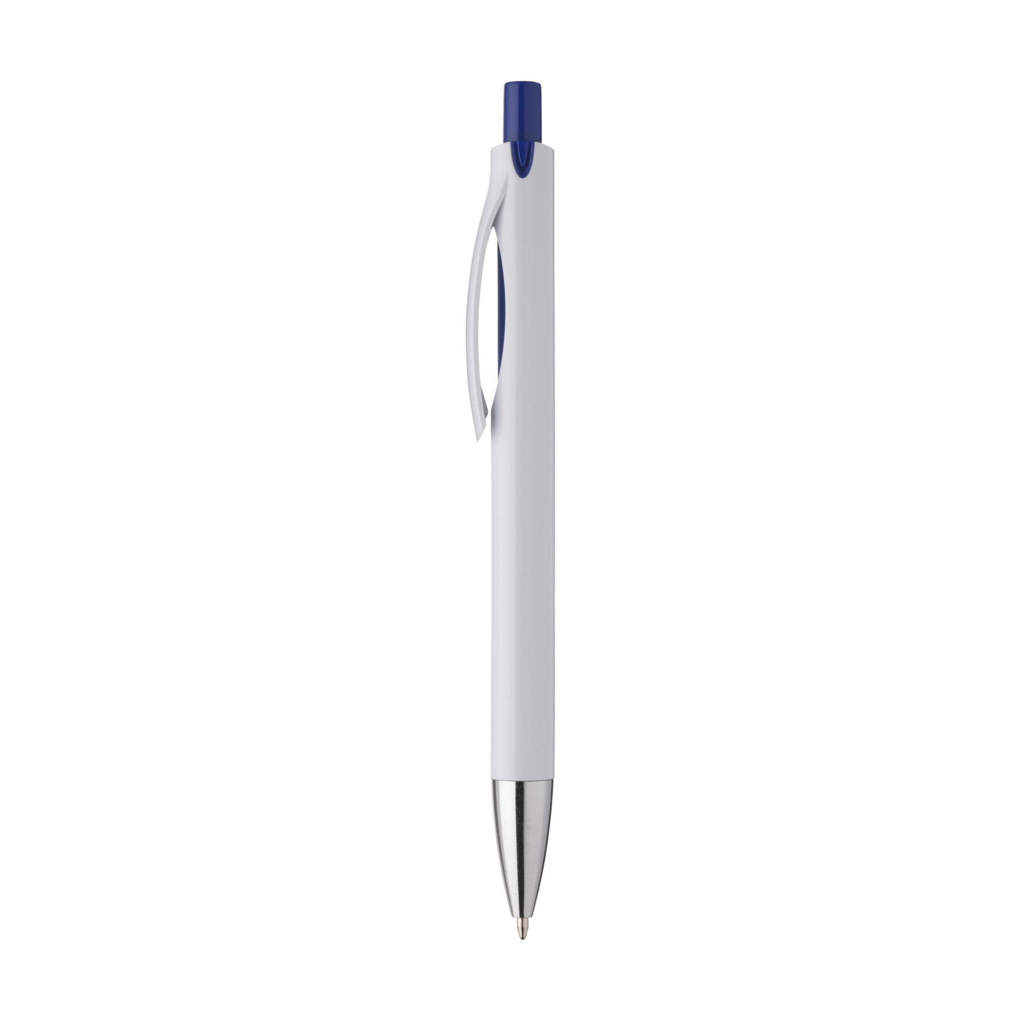 Stiilse disainiga sinise tindiga pastapliiats: selle pliiatsi korpus ja klamber on integreeritud. Klambri all silmatorkav värviaktsent. See aktsentvärv sobib surunupu värviga.