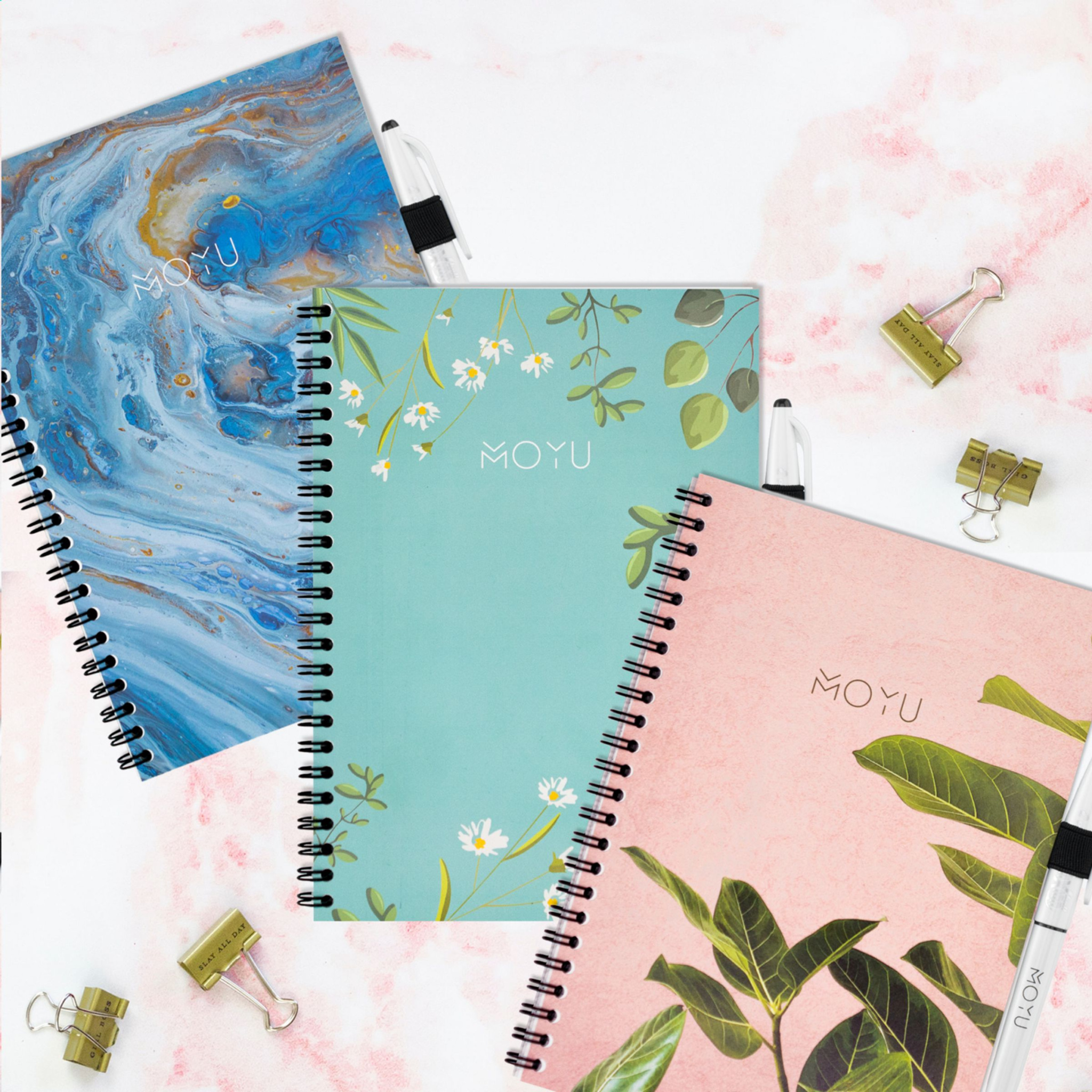 MOYU kaubamärgiga A5 kustutatav kivipaberist märkmik. Painduva 400 grammi pehme kattega. See märkmik sisaldab pliiatsit ja puhastuslappi. Iga kivipaberileht on jätkusuutlikult toodetud, looduslikult puuvaba ja 100% taaskasutatav. See elastse pliiatsiaasaga märkmik on köidetud tugevasse traatköites ja sellel on 18 lehekülge joonpaber, tühi paber. Tehke märkmeid kaasasoleva spetsiaalse MOYU pliiatsiga. See pliiats sisaldab originaalset Frixioni tinti. See spetsiaalne tint kuivab täielikult kivipaberil ja seda on lihtne kustutada ilma jälgi jätmata. Niisutage kaasasolevat MOYU lappi veidi veega ja kustutage tint. Nii jäävad leheküljed uute ideede ja ülesannete nimekirjade jaoks tühjaks. Kivipaberile saab kirjutada keskmiselt 500 korda. See märkmik kestab teile aastaid. Tellides 50 tükki või rohkem, saate valida, et kaanele trükitakse teie enda täisvärvikujundus. Kivipaber on valmistatud 80% lubjakivist ja 20% puhtast plastikust. See on loomulikult puudevaba ja selle valmistamiseks pole vaja vett ega kemikaale. Kivipaberi tootmine on seega säästlikum ja toodab 67% vähem CO2 kui paberimassi tootmisel. Lisaks saab kivipaberit lõputult taaskasutada, ilma et oleks vaja lisada uusi tooraineid.