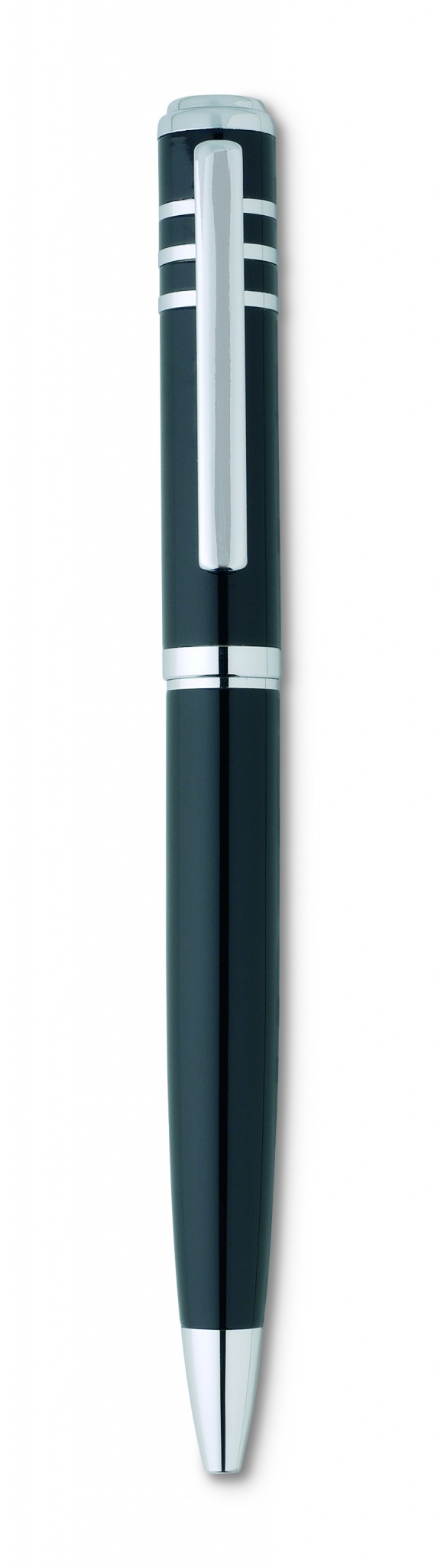 Läikiva lakiga metallist keermega pastakas pappkinkekarbis. Must tint.