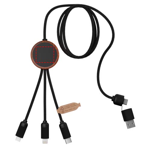 5-ühes taaskasutatud PET-logoga laadimiskaabel ümmarguse bambusest korpusega. Mõlemal küljel on nähtav valgustusega logo. Sellel on 3 pistikut (tüüp C, mikro-USB, iPhone) ja kahekordne USB-pistik universaalseks kasutamiseks. Tarnitakse jõupaberikaardiga TPU kotis. Kaabli pikkus: 1 meeter. Sisaldab 3-aastast garantiid.