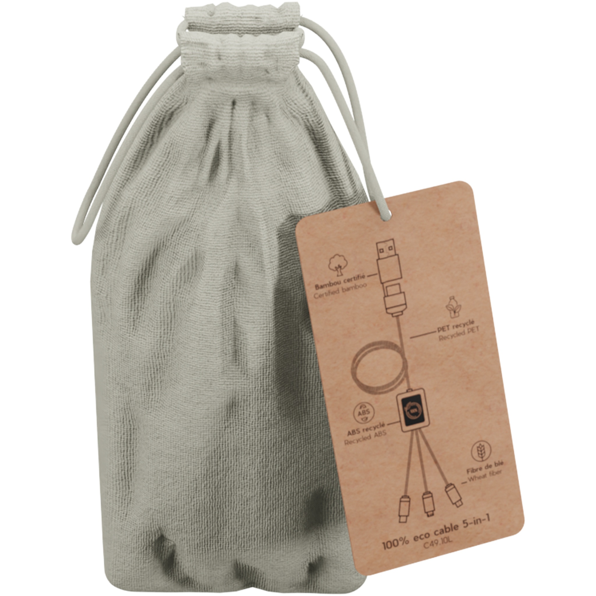2,4A kiirlaadimiskaabel (3 x 10 cm), mida saab kohandada mõlemal küljel valgustatud logoga, mis võivad samuti üksteisest erineda. See kaabel on täielikult valmistatud säästvamatest materjalidest: taaskasutatud PET-nöörid, bambus, nisukiud ja taaskasutatud plast. Laadimiskaabel on tehtud universaalseks tänu kolmele väljundile (Type-C, Android, iPhone) ja sellega saab laadida korraga kuni kolme seadet. Tänu topelt-USB- ja USB-C-sisendile ühildub see kaabel kõige uuemate laadijatega. Tarnitakse puuvillases kotis (20 x 8 cm) koos jõupaberikaardiga.