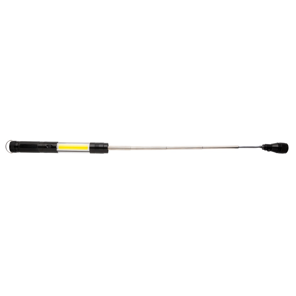 Ideaalne töövalgusti igaks vajaduseks – see topeltmagnetiline LED-töövalgusti sobib suurepäraselt mis tahes metallpinnale kinnitamiseks optimaalse valgustuse tagamiseks. See alumiiniumist taskulamp võimaldab pikendada selle tavasuurusest 26 cm-st 64 cm-ni, võimaldades teil korjata raskesti nähtavatesse kohtadesse kinni jäänud esemeid, mille ees on magnet. See taskulamp on varustatud kolme 10-liitrise LED-iga, mis tagavad eriti ereda särituse pimedas ruumis, ja 80-luumenilise COB-valgusega. Kui taskulambi pea on välja sirutatud, muutub pea painduvaks ja seda saab reguleerida igas suunas. Sisaldab patareisid otseseks kasutamiseks.
