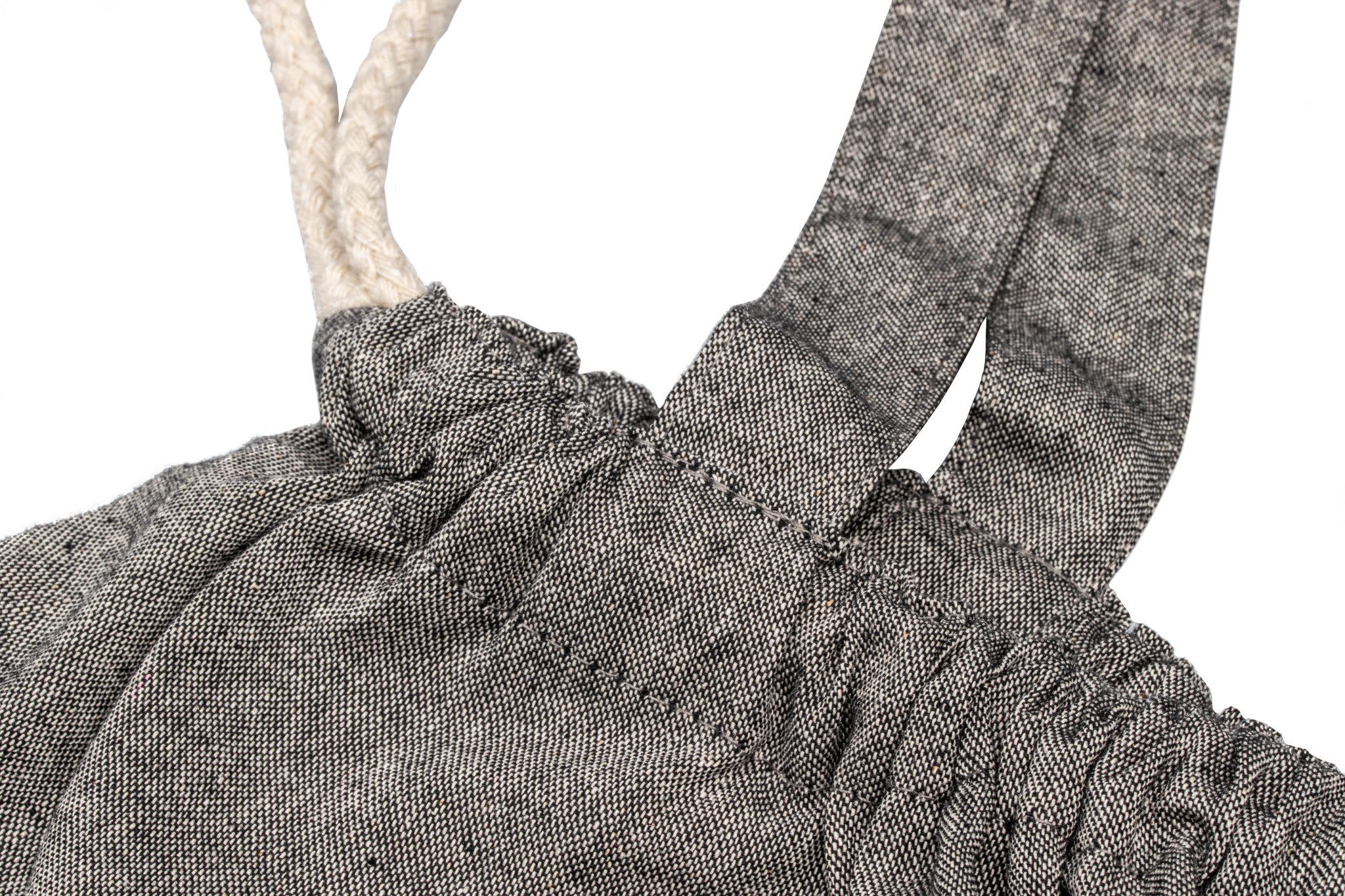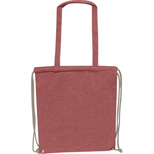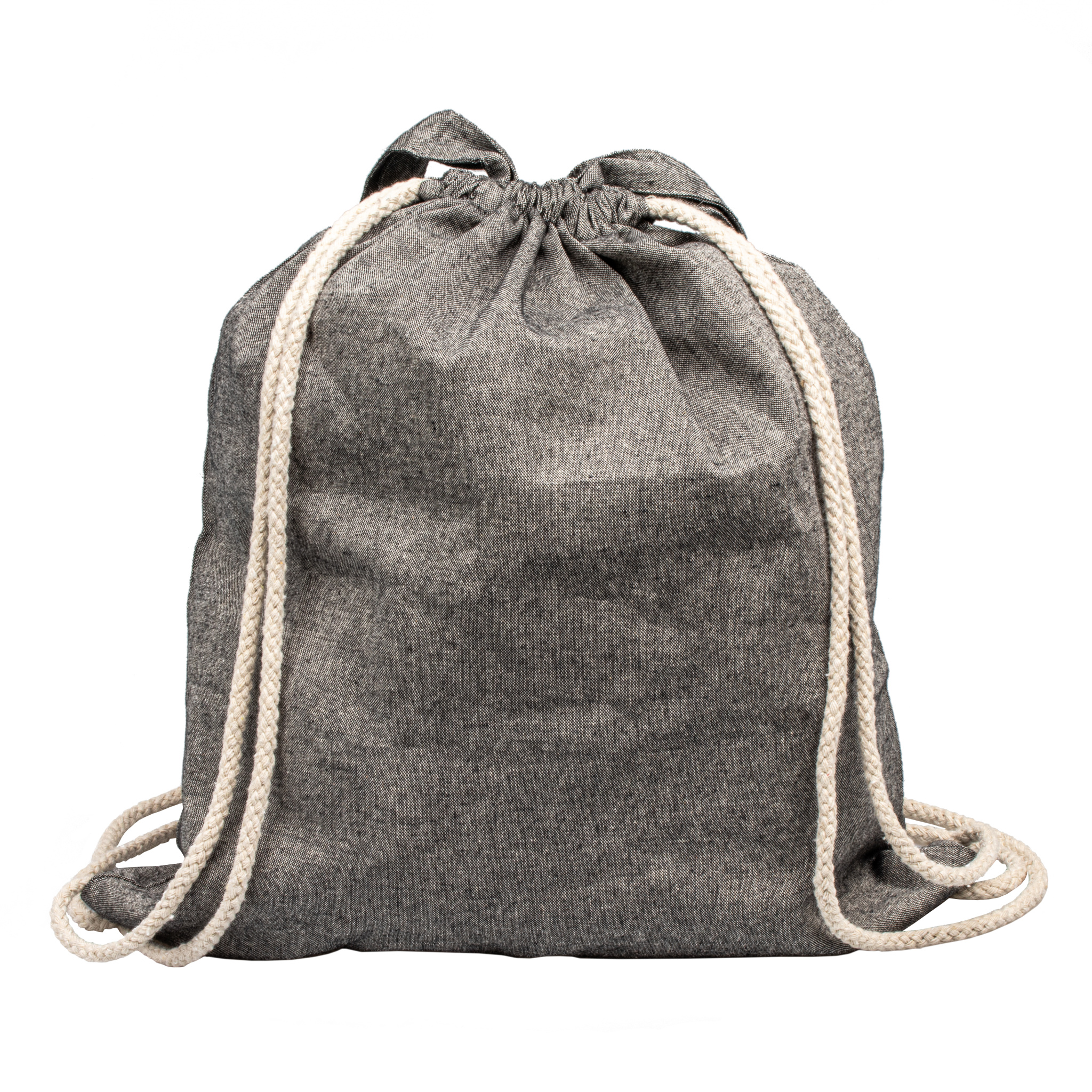 Öko-Tex® STANDARD 100 sertifikaadiga taaskasutatud puuvillast kott, millel on pikad kandesangad, täiendavad kandmisnöörid ja grammkaal 140g/m². Logo on trükitud koti ühele küljele.