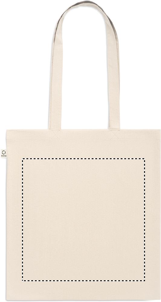 Tarbimiseelsest taaskasutatud puuvillasest ostukott (70% taaskasutatud puuvill ja 30% RPET) pikkade sangadega. 140 gr/m².