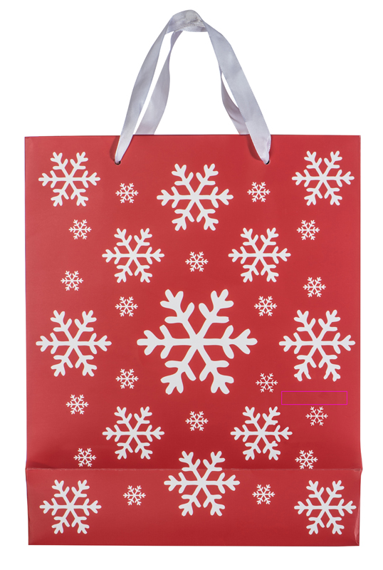 Lumehelbekujundusega ja kahe sangaga paberist jõulukinkekott. Trükime teie logo sildile.