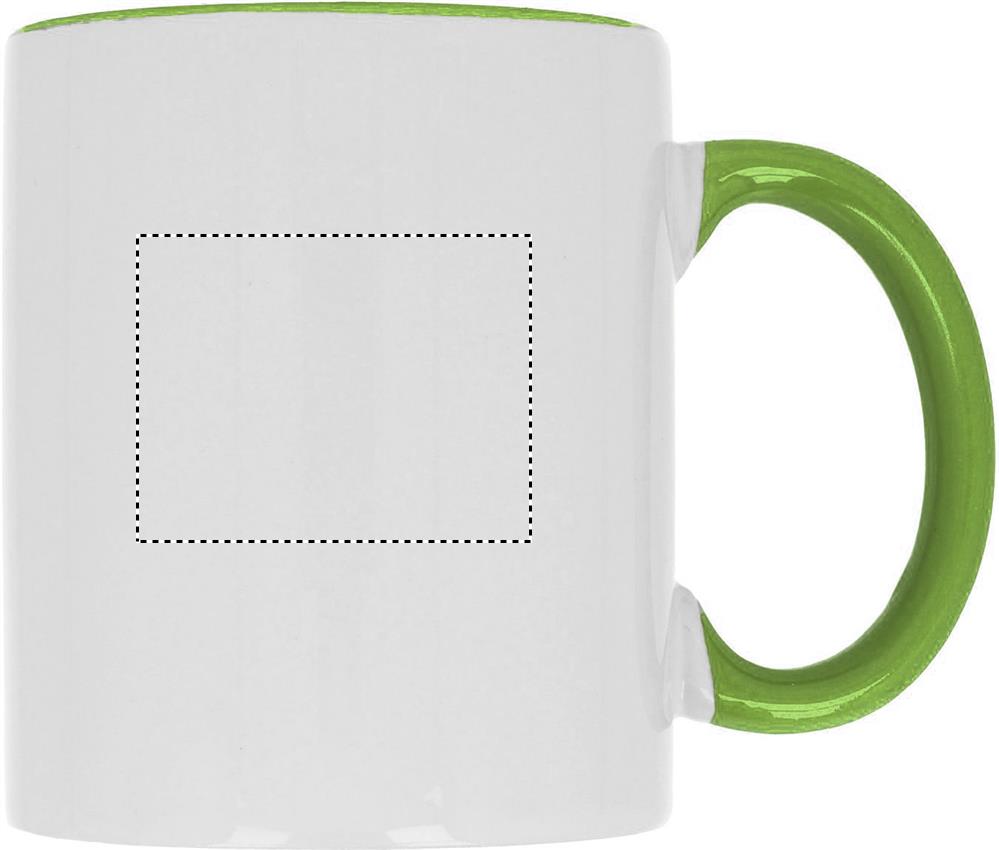 Keraamiline kruus mahuga 300 ml spetsiaalse kattega sublimeerimiseks värvilise käepidemega ja sees. Individuaalne pakkimine valgesse pappkarpi.
