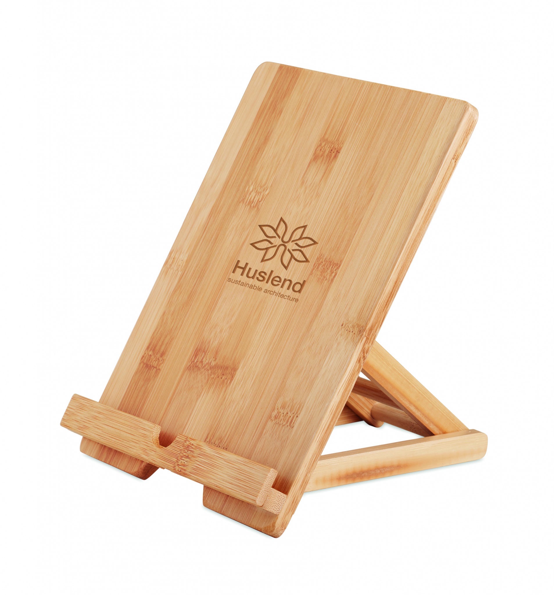 Bambusta valmistettu puhelin-/ tablettialusta. Luonnollisen materiaalin (bambu) vuoksi, tuotteiden värissä/ koossa saattaa olla erinäisyyksiä ja tämä voi vaikuttaa painatuksen lopputulokseen.