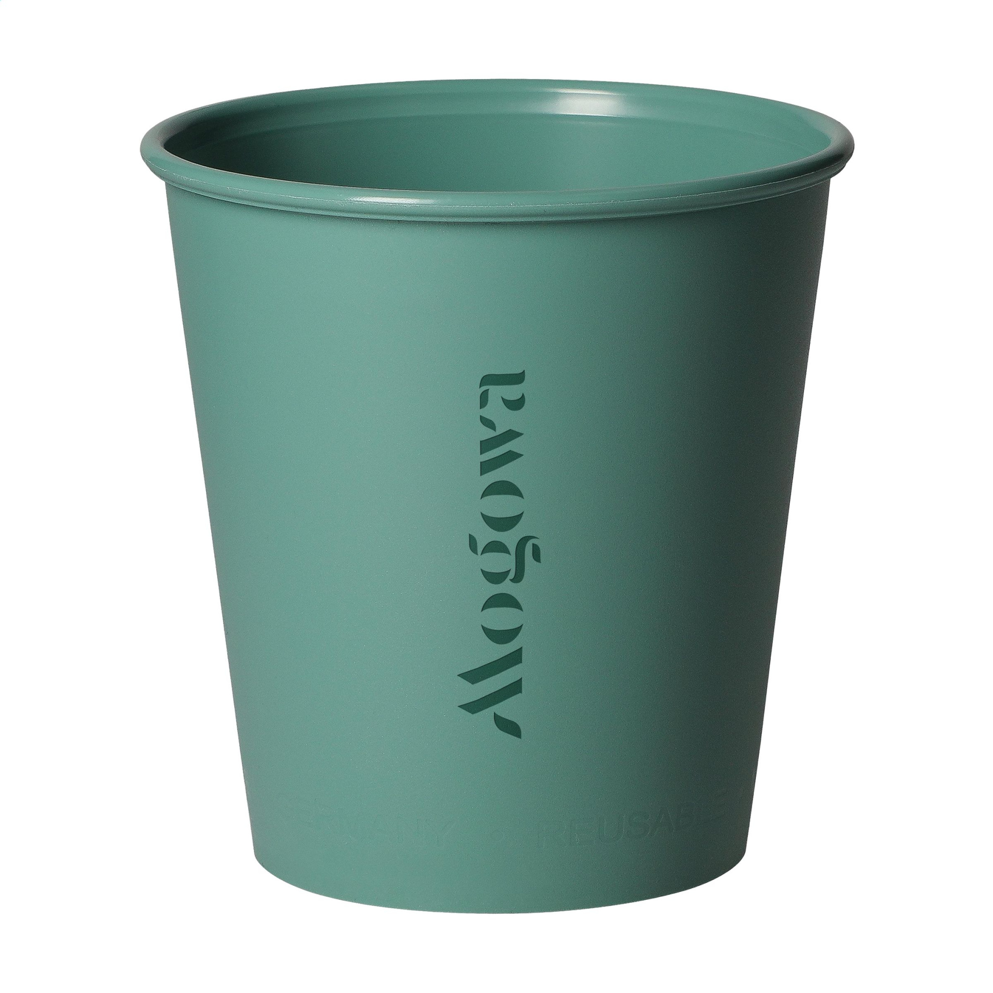 Uudelleenkäytettävä juomakuppi, joka on valmistettu uusiutuvista lähteistä peräisin olevasta biopohjaisesta materiaalista. Tämä pinottava kuppi on hyvä vaihtoehto kertakäyttöiselle kahvikupille. Sopii melkein minkä tahansa kahvinkeittimen alle. 100 % kierrätettävä ja BPA-vapaa. Tämä tuote on astianpesukoneen kestävä. Käsinpesu on suositeltavaa painatuksen säilyttämiseksi. Tilavuus 200 ml. Valmistettu Saksassa.