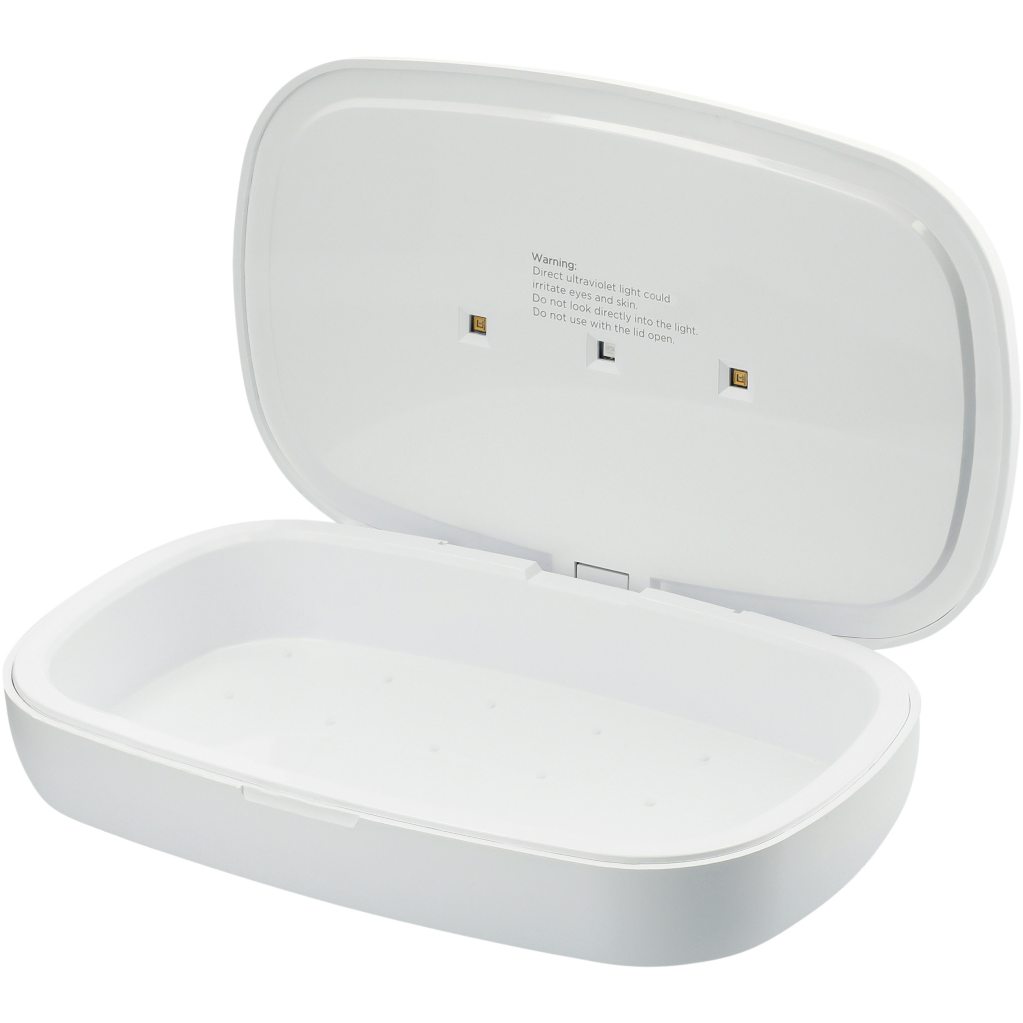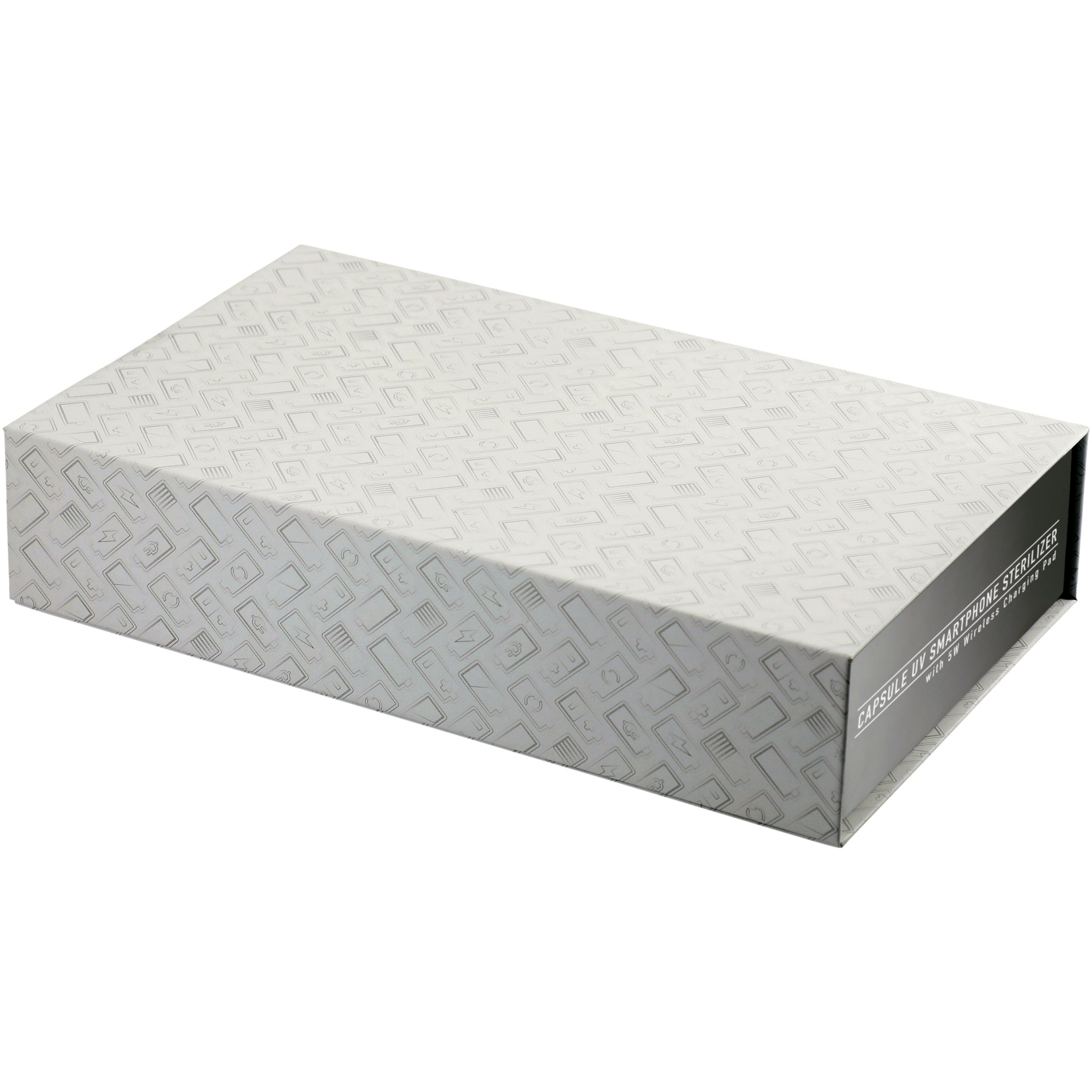 Capsule Älypuhelimen UV-puhdistaja 5 W:n langattomalla latausalustalla. Tuotteella voi ladata ja puhdistaa älypuhelimen sisäänrakennettujen UV-C-LED-valojen avulla. Desinfiointitiloja on kaksi. Aloita lyhyt 90 sekunnin puhdistus painamalla painiketta kerran. Aloita viiden minuutin syväpuhdistus painamalla painiketta kaksi kertaa. Älypuhelinten lisäksi Capsule voi puhdistaa kaiken laatikkoon mahtuvan, kuten avaimet, nappikuulokkeet ja muut henkilökohtaiset tavarat. Testien perusteella se poistaa jopa 99,9 % bakteereista, kuten Escherichia coli, Staphylococcus ja Candida albican. Tuotetta ei voi käynnistää, kun kansi on auki, jotta käyttäjä ei altistu UV-valolle. Kun kotelo avataan desinfiointiprosessin aikana, laite estää silmien/ihon altistumisen pysähtymällä heti. Pakattu ensiluokkaiseen lahjapakkaukseen. Sisämitat: 181 x 104 x 26 mm.