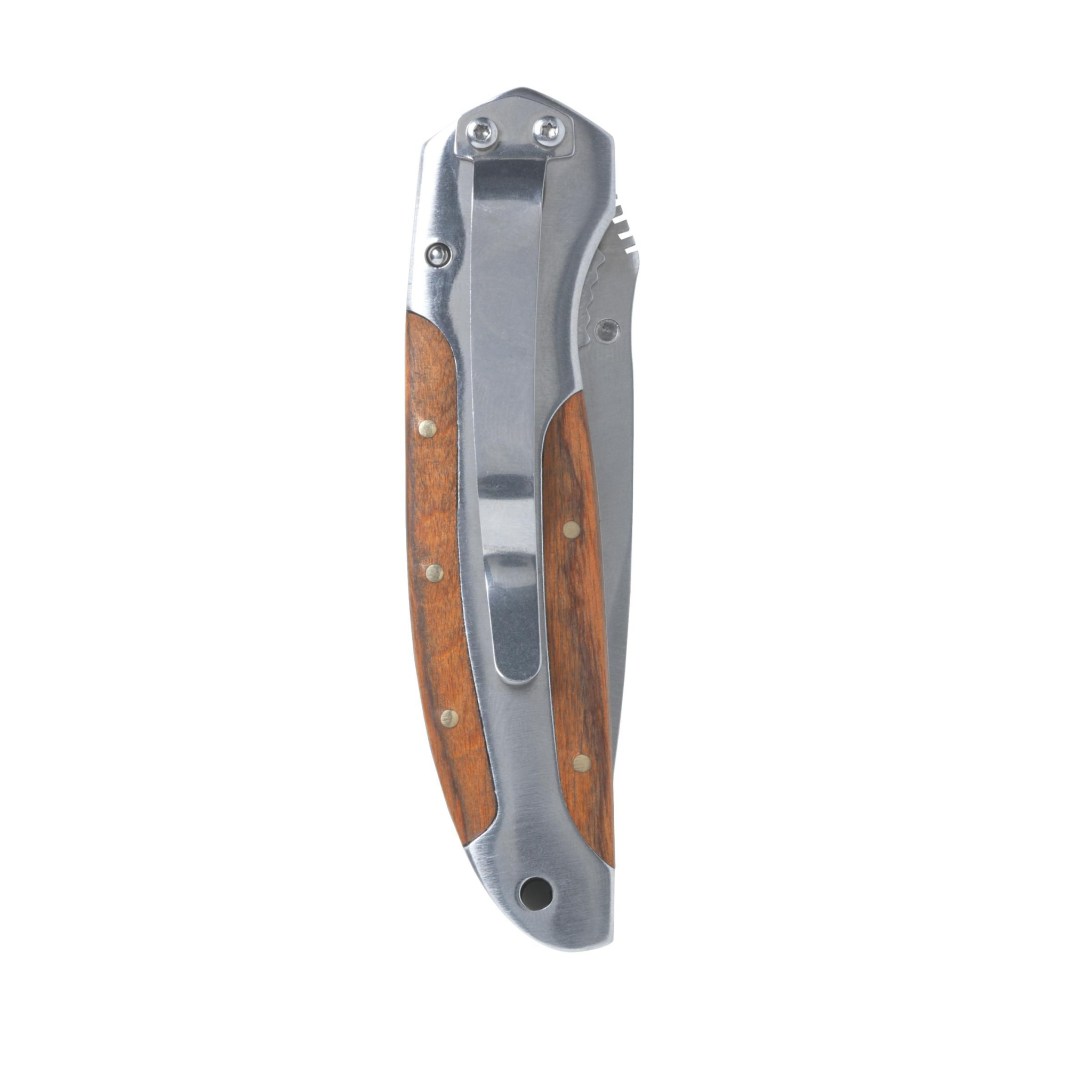 Tukeva ruostumattomasta teräksestä valmistettu selviytymisveitsi, jossa sahalaitainen terä, puinen upote kahvassa ja kätevä pidike. Huomaa, että veitsien tai monitoimityökalujen hallussapitoa ja/tai kantamista julkisilla paikoilla saattaa olla voimassa paikallisia sääntöjä. Jokainen tuote toimitetaan erillisessä ruskeassa pahvilaatikossa.
