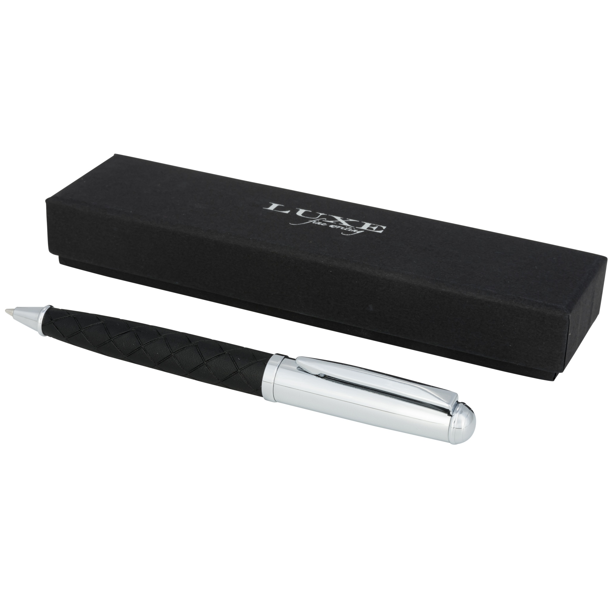 Ylellinen kuulakärkikynä nahkaviivakuviolla alaosan ympärillä. Sisältää korkealaatuisen mustan täyttöpakkauksen, pakattu ''LUXE''-lahjapakkaukseen (16x4.5x2.5cm).