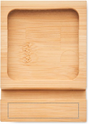 RPET-huopakynäteline, jossa on bambupohja ja jalustainen puhelinteline.