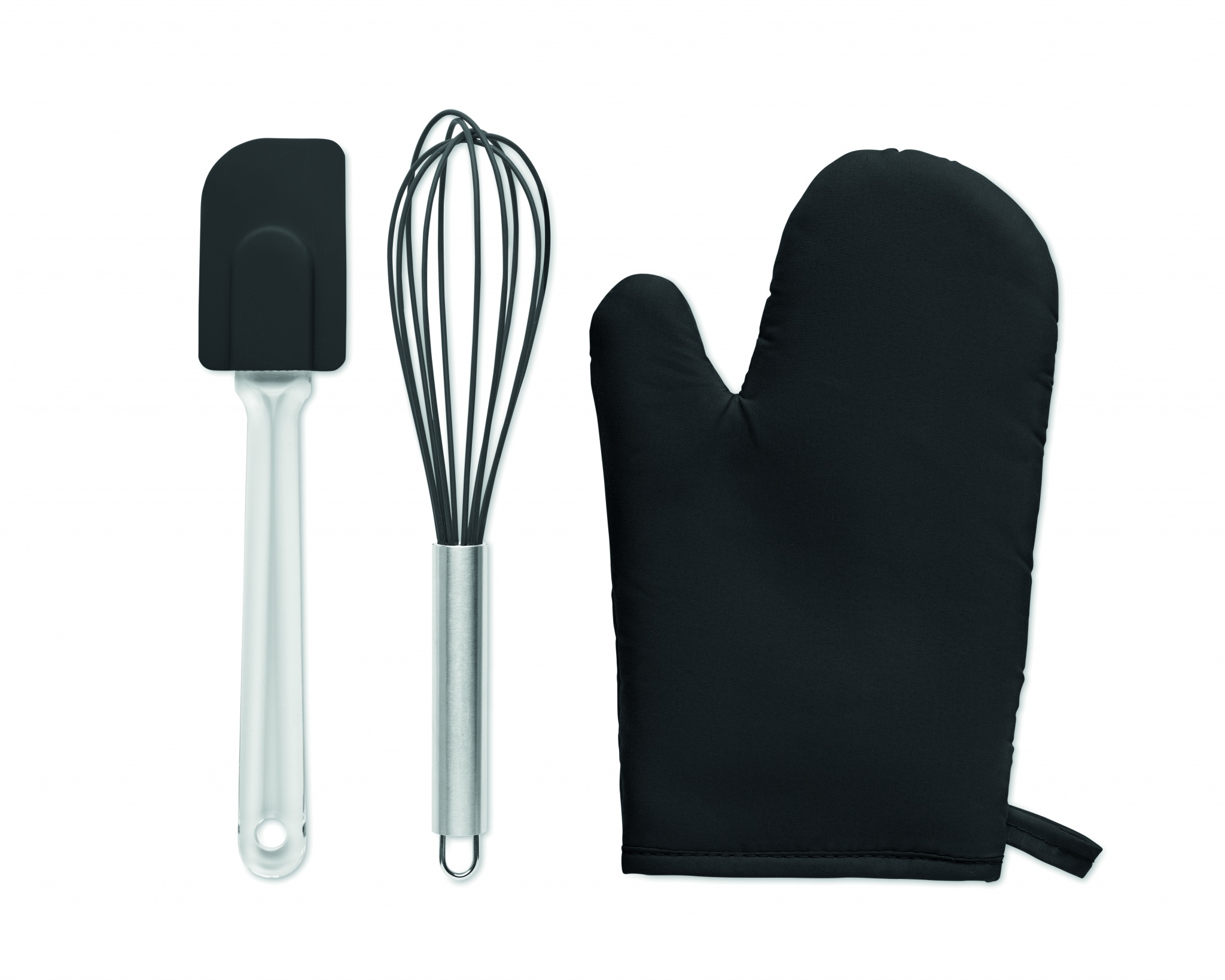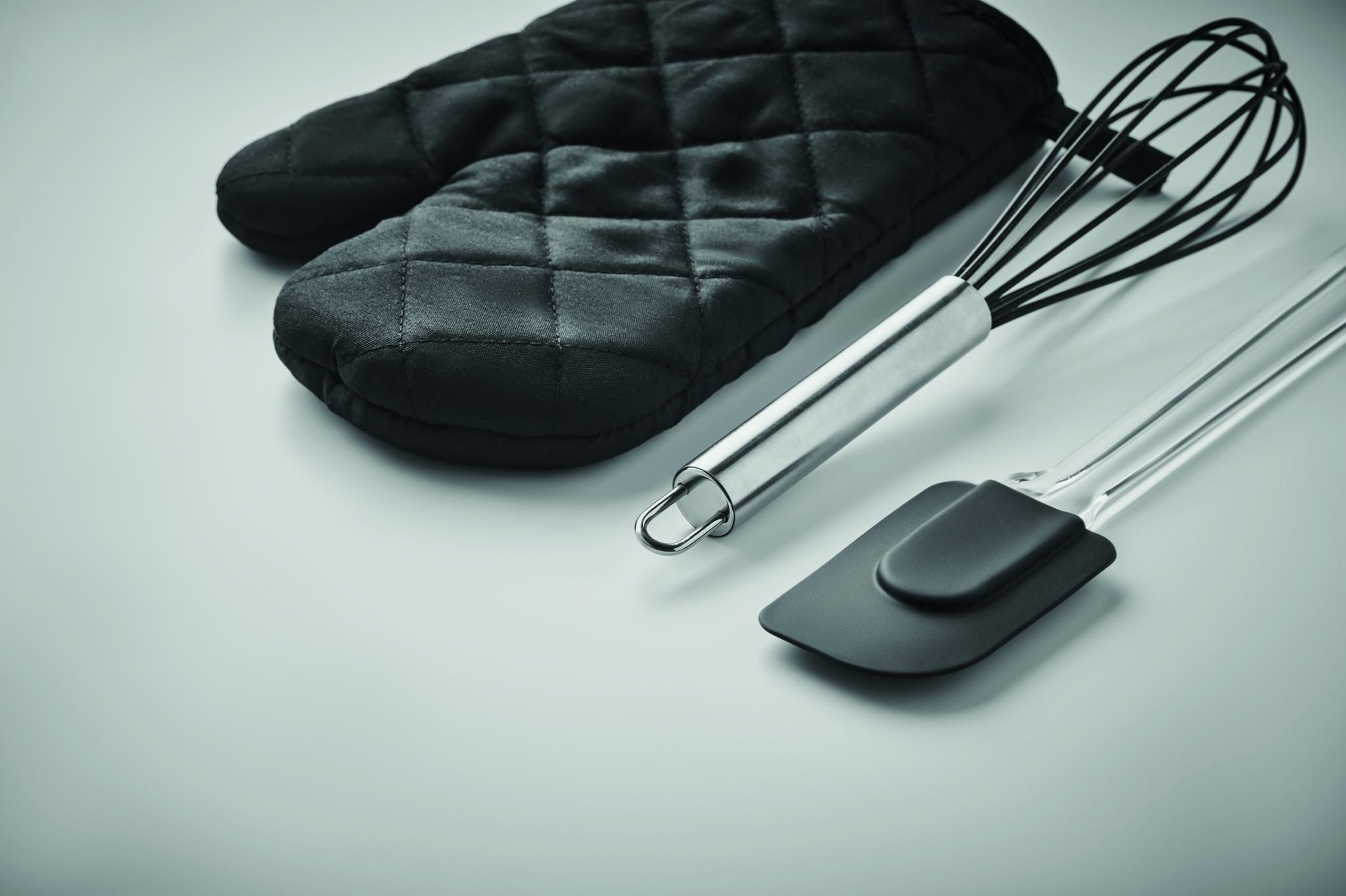 Leivontavälinesetti, sisältää polypuuvillaisen (95 % polyesteriä ja 5 % puuvillaa) patakintaan, vispilän ja silikonilastan.