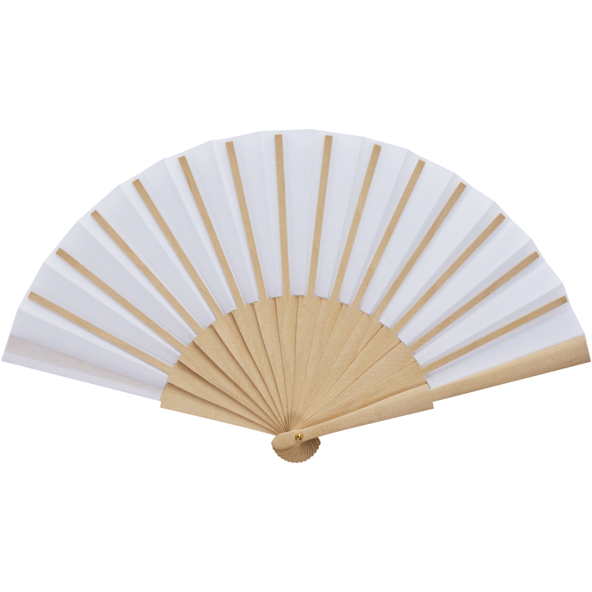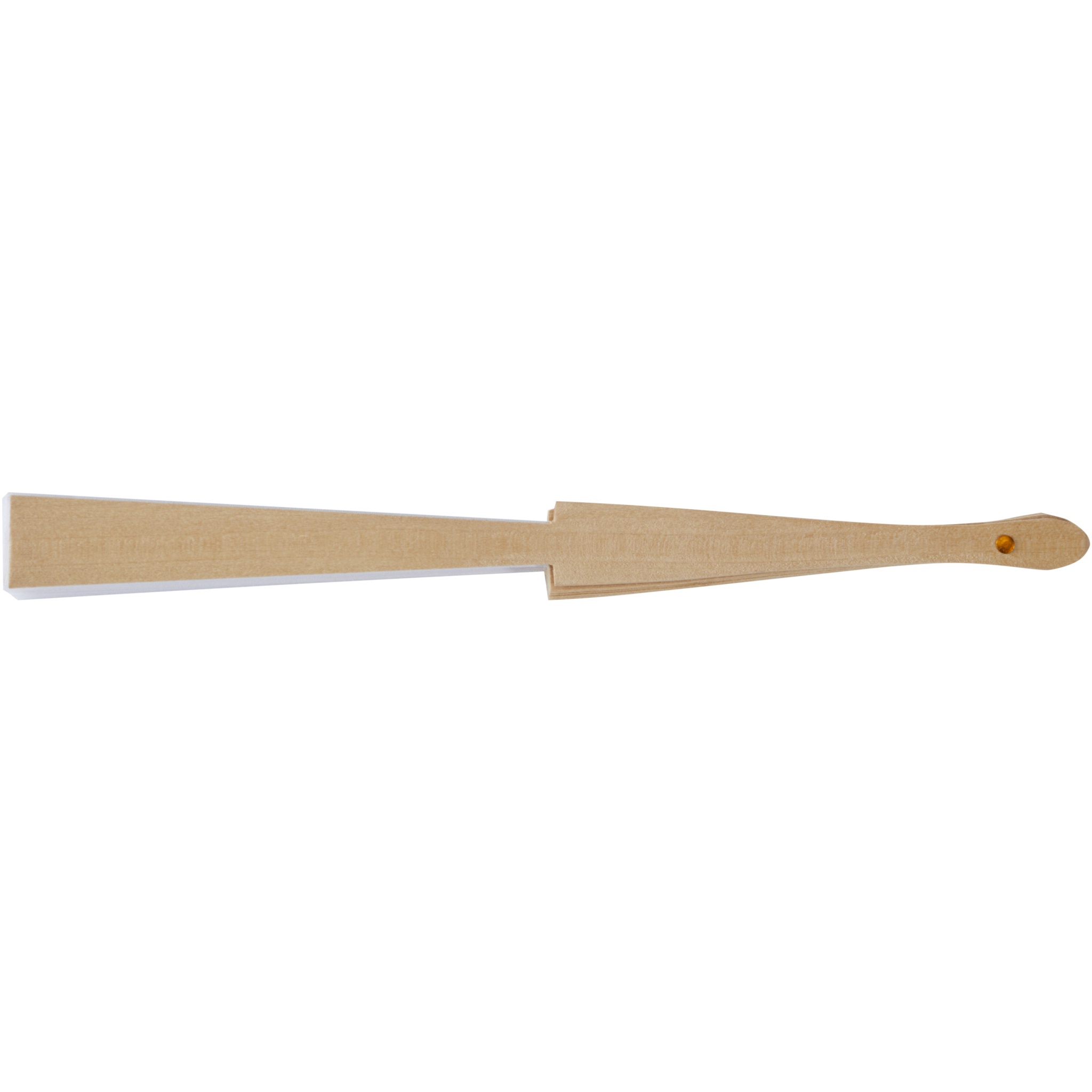 Puusta ja polyesteristä valmistettu käsituuletin, saatavana laaja värivalikoima.