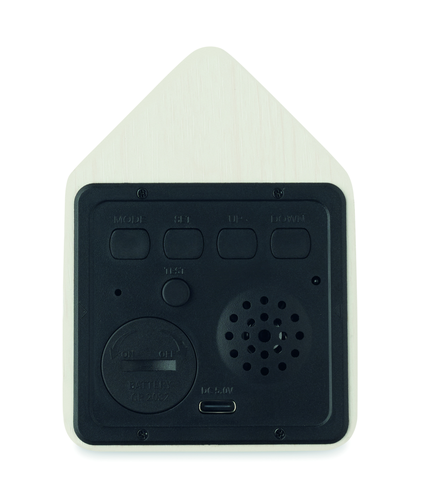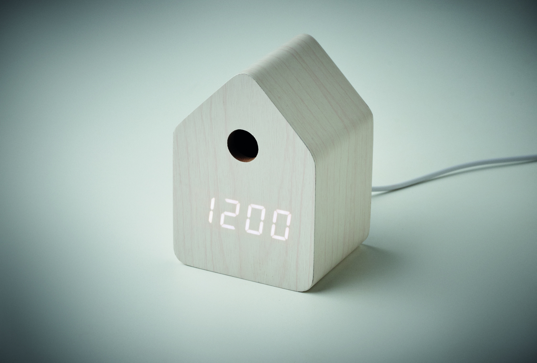 Pieni MDF-pöytäkello, jossa sisäänrakennettu herätys käen kukkuvalla äänellä ja lämpötilanäytöllä. Linnun käen ääni joka täysi tunti ja hälytyksen aikana. Valkoinen LED-näyttö. Ääni mykistyy automaattisesti klo 22.00–06.00. 5 minuutin torkkuvälit.