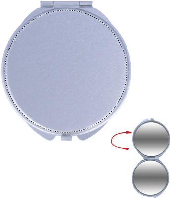 Alumiininen meikkipeili tavallisella ja suurentavalla peilillä, pakattuna sametti koteloon.