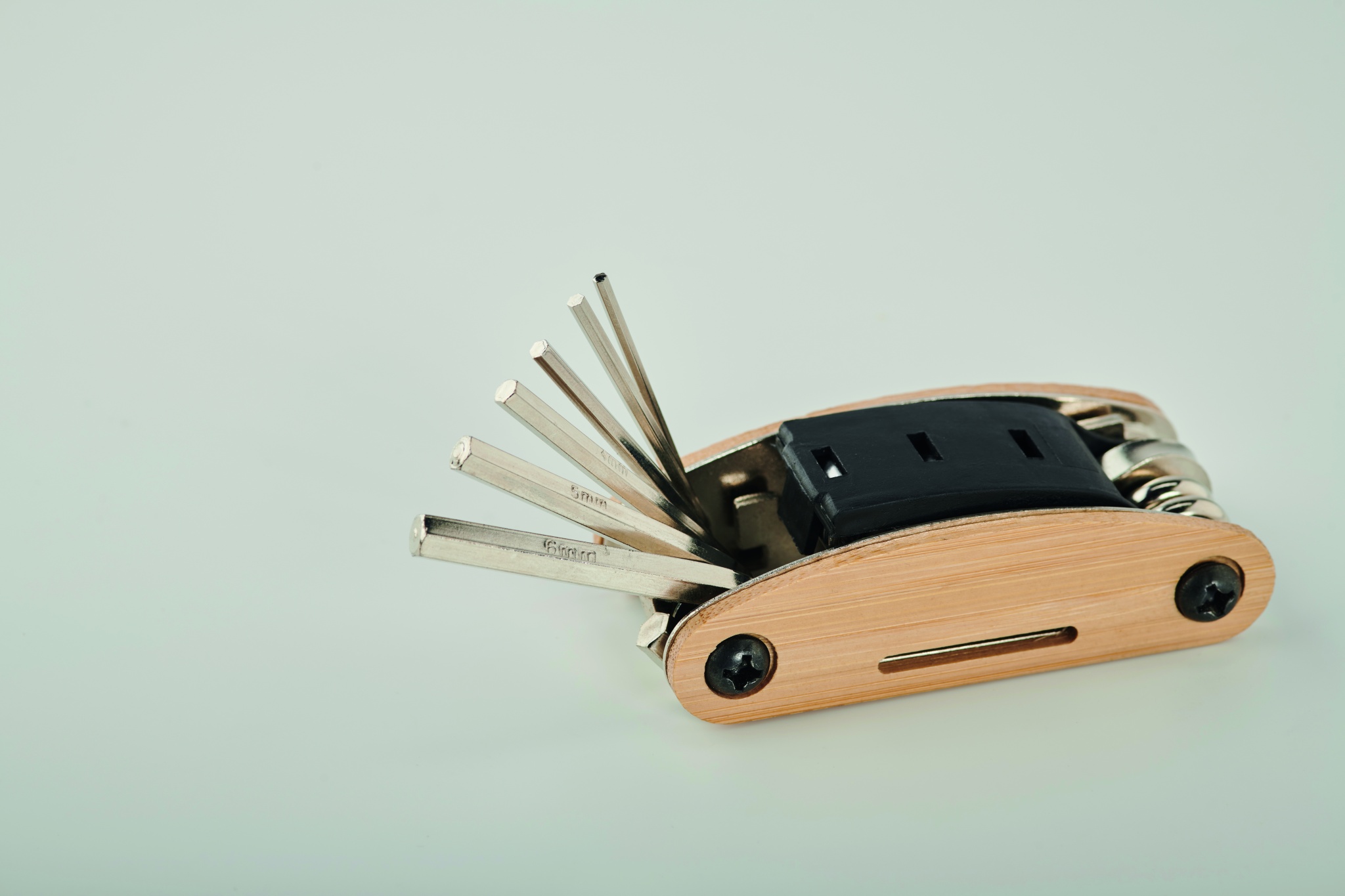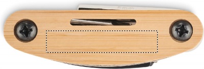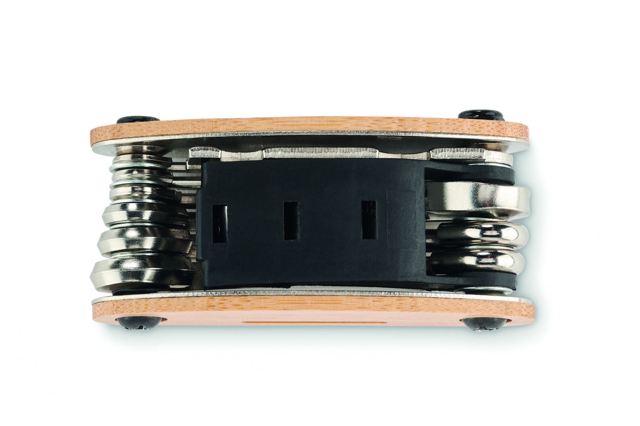 Ruostumattomasta teräksestä valmistettu monitoimityökalu, jossa on bambukuoret. 11 toimintoa. Sisältää: kuusiokoloavaimet, litteä jakoavain , hylsyn jatke, Phillips-ruuvimeisseli ja hylsyavain.