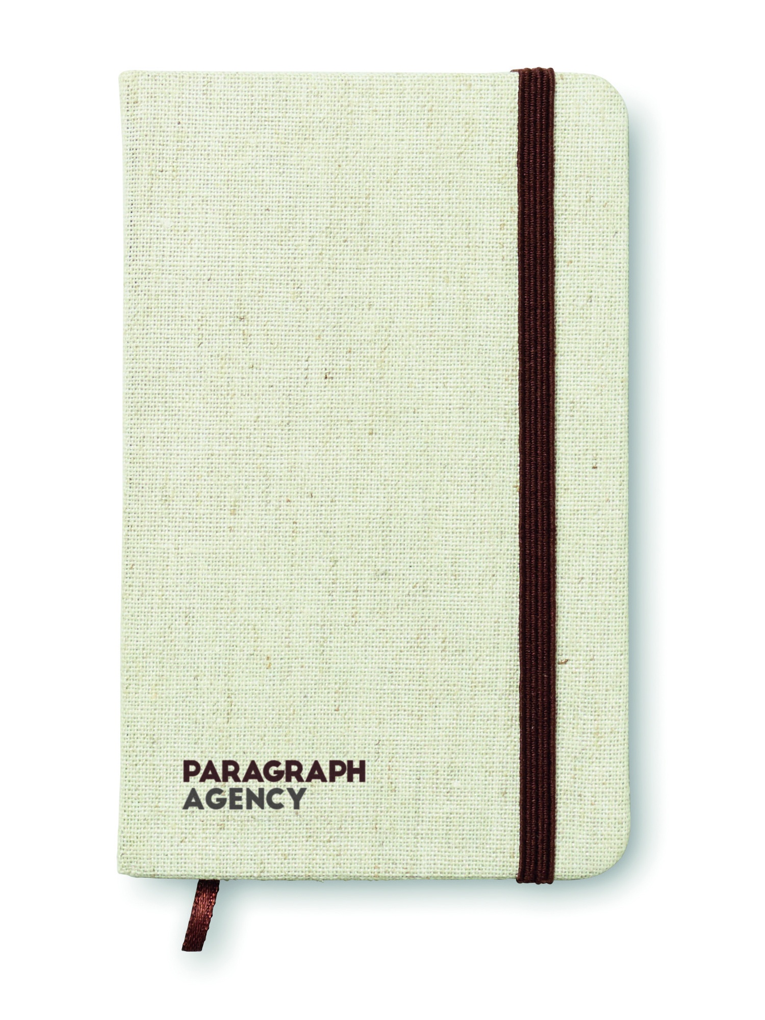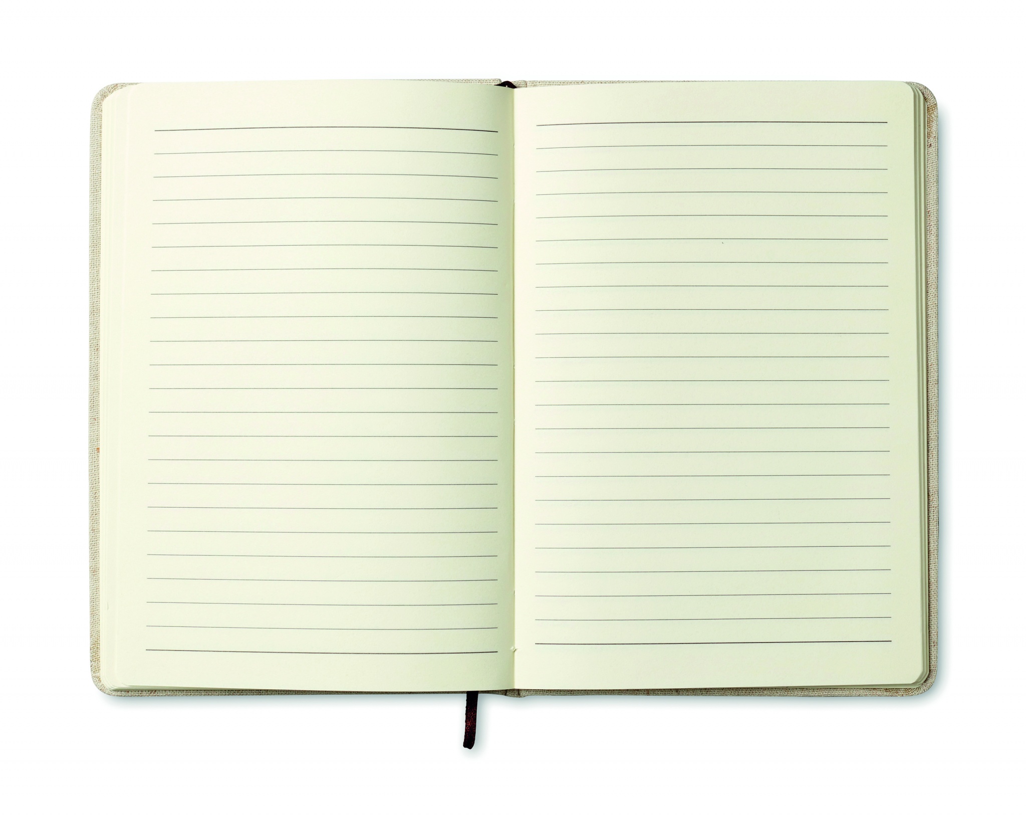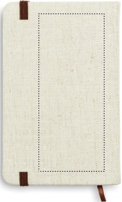A6 notebook with hard canvas cover. Casebound. 192 lined pages (96 sheets). Contrasting elastic closure strap and ribbon page-marker.