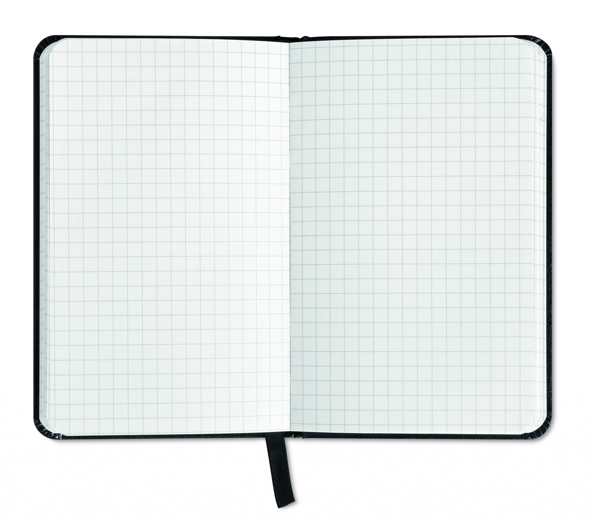 A5 muistikirja PVC laminoidulla kannella, 192 ruuduitettua sivua (96 arkkia) sisältää väriltään yhteensopivan kuminauhan ja kirjanmerkin.