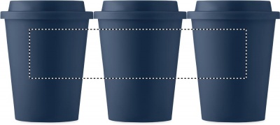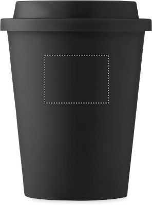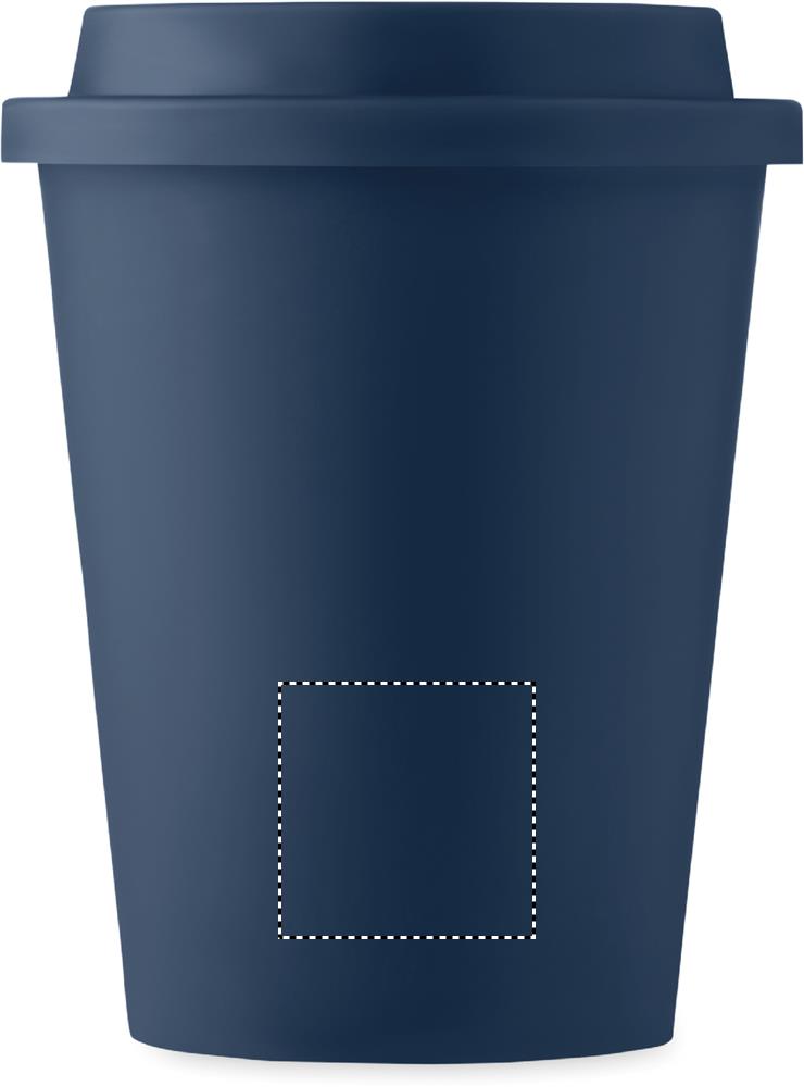 Kaksiseinäinen 300 ml muki PP kannella. Yksinkertainen tumbler-muki, joka pitää juomasi lämpimänä pitkään. Kannessa on juoma-aukko.