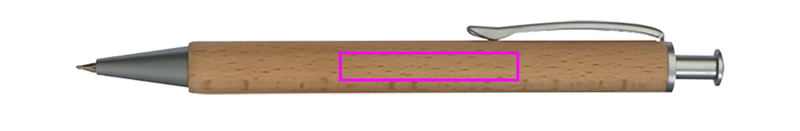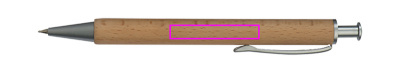 Puinen kuulakärkikynä, jossa on sinikirjoitusmetallijärjestelmän täyttö ja puinen kotelo. Laserkaiverrus on asennettu pidikkeen alle.