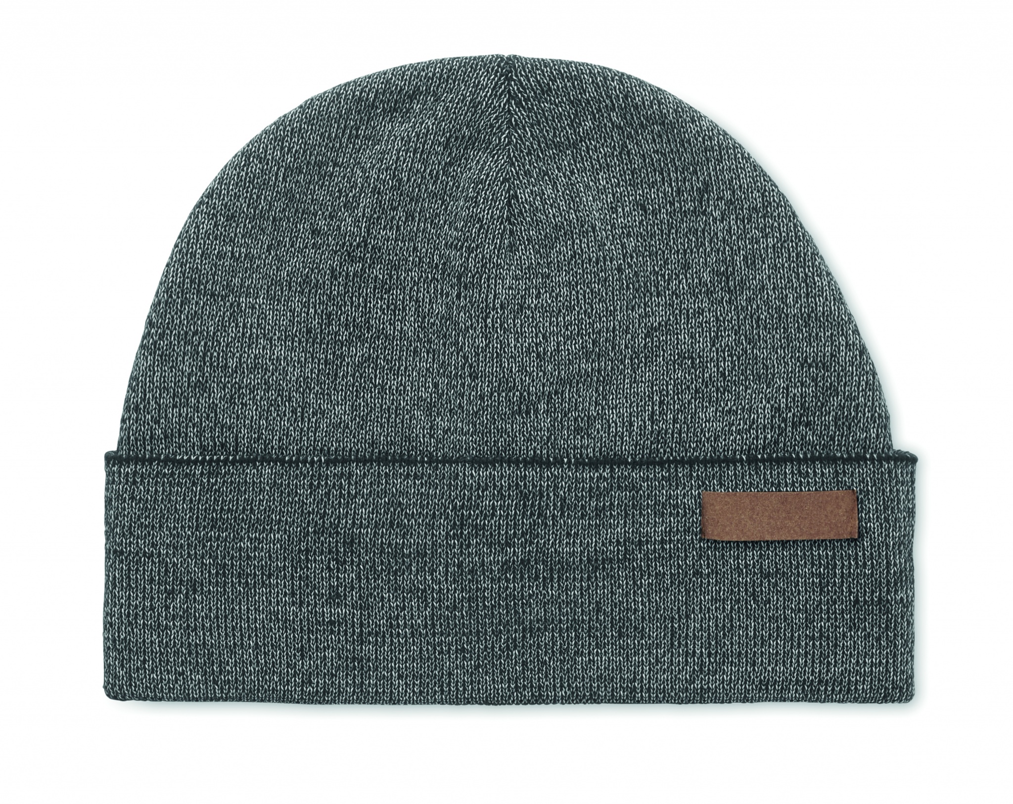 Unisex akryylistä valmistettu kaksipuoleinen pipo, 30 % heijastinnauhalla ja etiketti painatusaluetta varten.