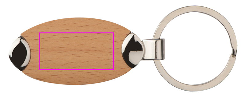 Tyylikäs metalliavainrengas, jossa on puinen sisäosa, johon logosi kaiverretaan.
