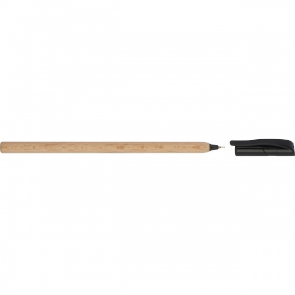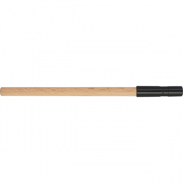 Kätevä, puusta valmistettu musta kirjoituskuulakynä mustalla muovikorkilla. Logosi kaiverretaan.