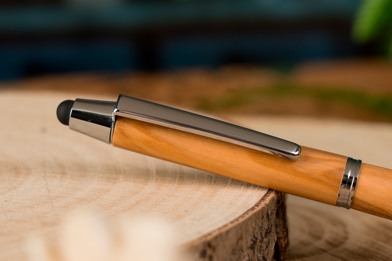 Oliivipuusta valmistettu kuulakärkikynä, kosketustoiminto ja sininen kirjoitustäyttö. Logosi kaiverretaan klipin alle.
