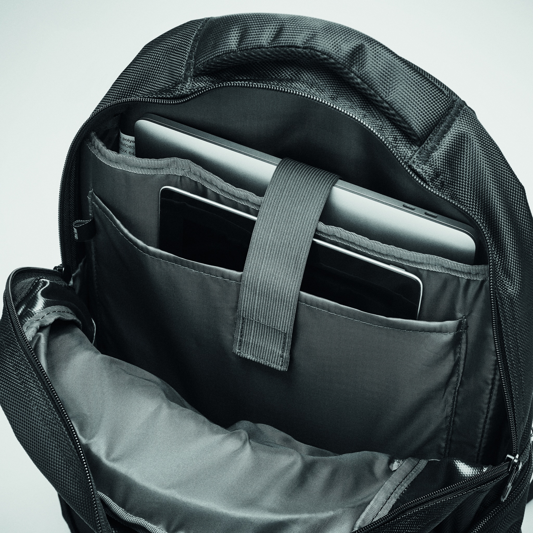 1680D polyesterinen reppu, 15 tuuman kannettavan tietokoneen taskulla. Sisältää useita taskuja ja kynänpidikkeen, pehmustettu selkä ja olkahihnat.