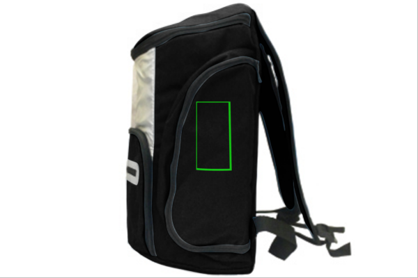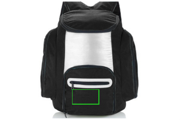 600D kylmälaukku selkäreppuna, metallipinnoite sisäpuolella pitää ruoan ja juomat kylminä. Etupuolella on lisätasku, jossa on painettu värikuvio vetoketjun ympärillä, muiden tavaroiden säilyttämiseen.