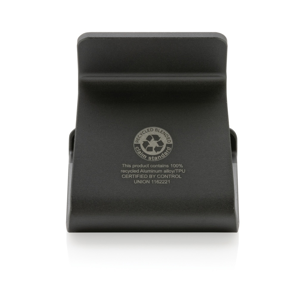 Alumiininen puhelinteline valmistettuna RCS (Recycled Claim Standard) sertifioidusta kierrätetystä alumiinista ja TPU:stä. Kierrätetyn materiaalin kokonaismäärä: 100% perustuen tuotteen kokonaispainoon. RCS-sertifiointi varmistaa kierrätysmateriaalien täysin sertifioidun toimitusketjun. Alumiini ei menetä ominaisuuksiaan kierrätysprosessissa ja sitä voidaan kierrättää loputtomasti. Yhteensopiva kaikenkokoisten puhelimien ja tablettien kanssa. Pakattu FSC® sekoituksesta valmistettuun pakkaukseen.