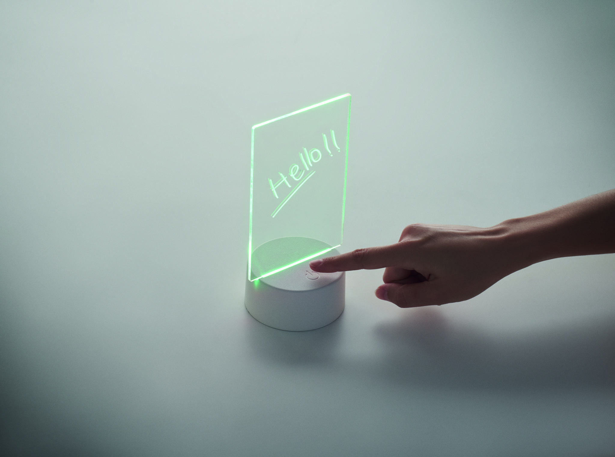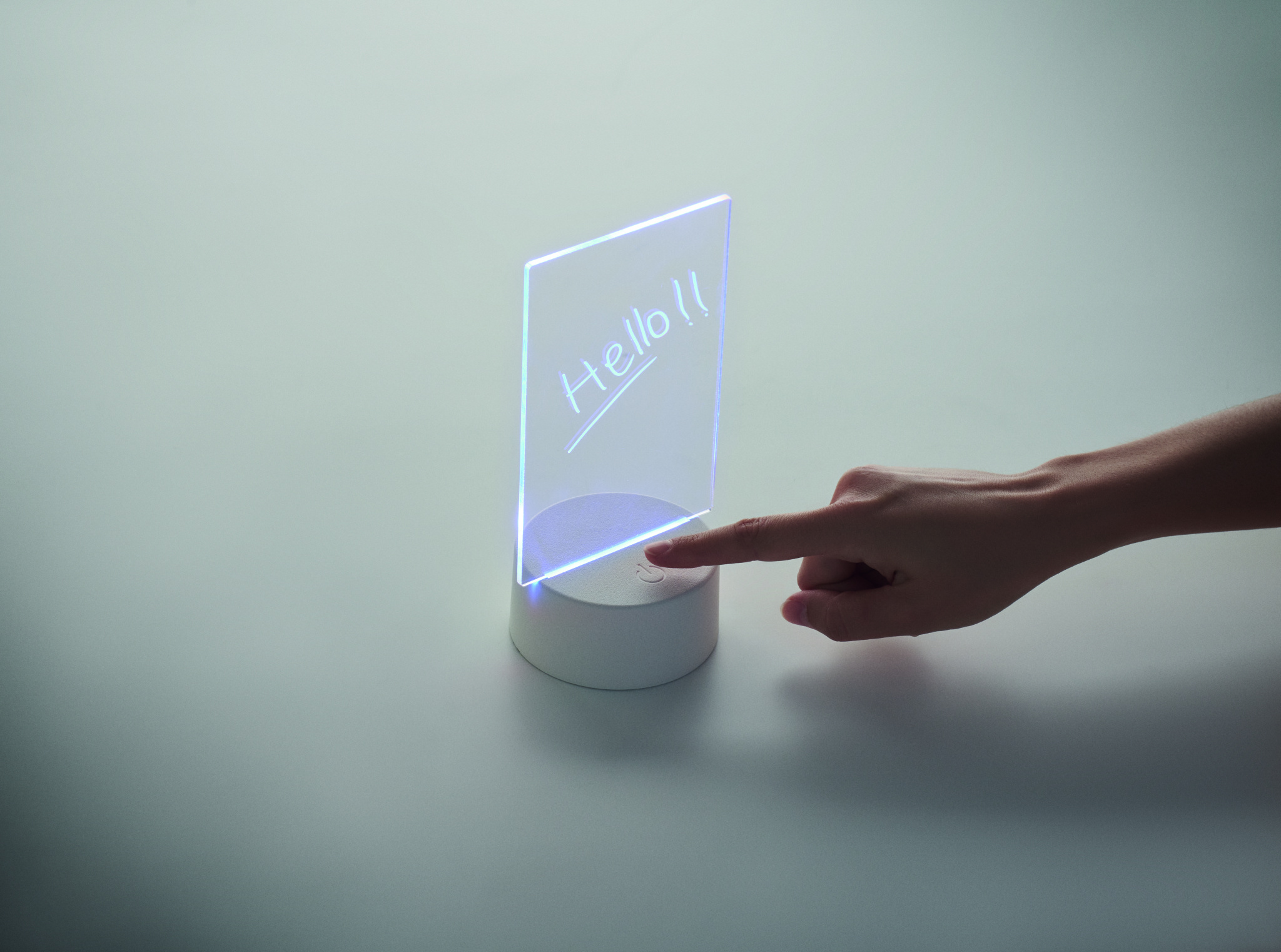 Valaistu LED-muistitaulu, jossa on väriä vaihtava valo ja pyyhittävä valkoinen tussi. Akryylitaulu ja alumiinijalusta. Paristokäyttöinen, vaatii 3 AAA-paristoa (eivät sisälly pakkaukseen).