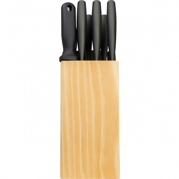 14-osainen veitsilohkosarja, jossa titaanipinnoitetut terät ja kiinteä puuteline (mänty). Täydellinen lisävaruste jokaiseen hyvin varustettuun keittiöön ja erinomainen alusta logollesi. Kaiverramme tämän veitsilohkoon.