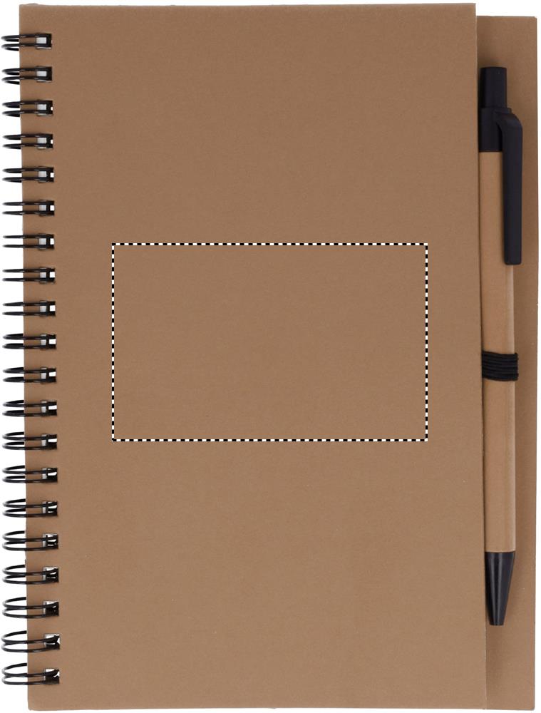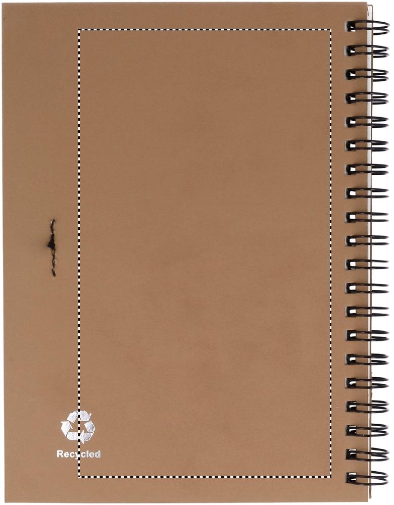 Perdirbto popieriaus sąsiuvinis su rašikliu. Dvigubas laidas. 140 paprasto perdirbto popieriaus puslapių (70 lapų). Stumdomas tušinukas perdirbtoje kartoninėje dėžutėje ir biologiškai skaidomame plastike. Mėlynas rašalas. Juodas elastingas rašiklio laikiklis.