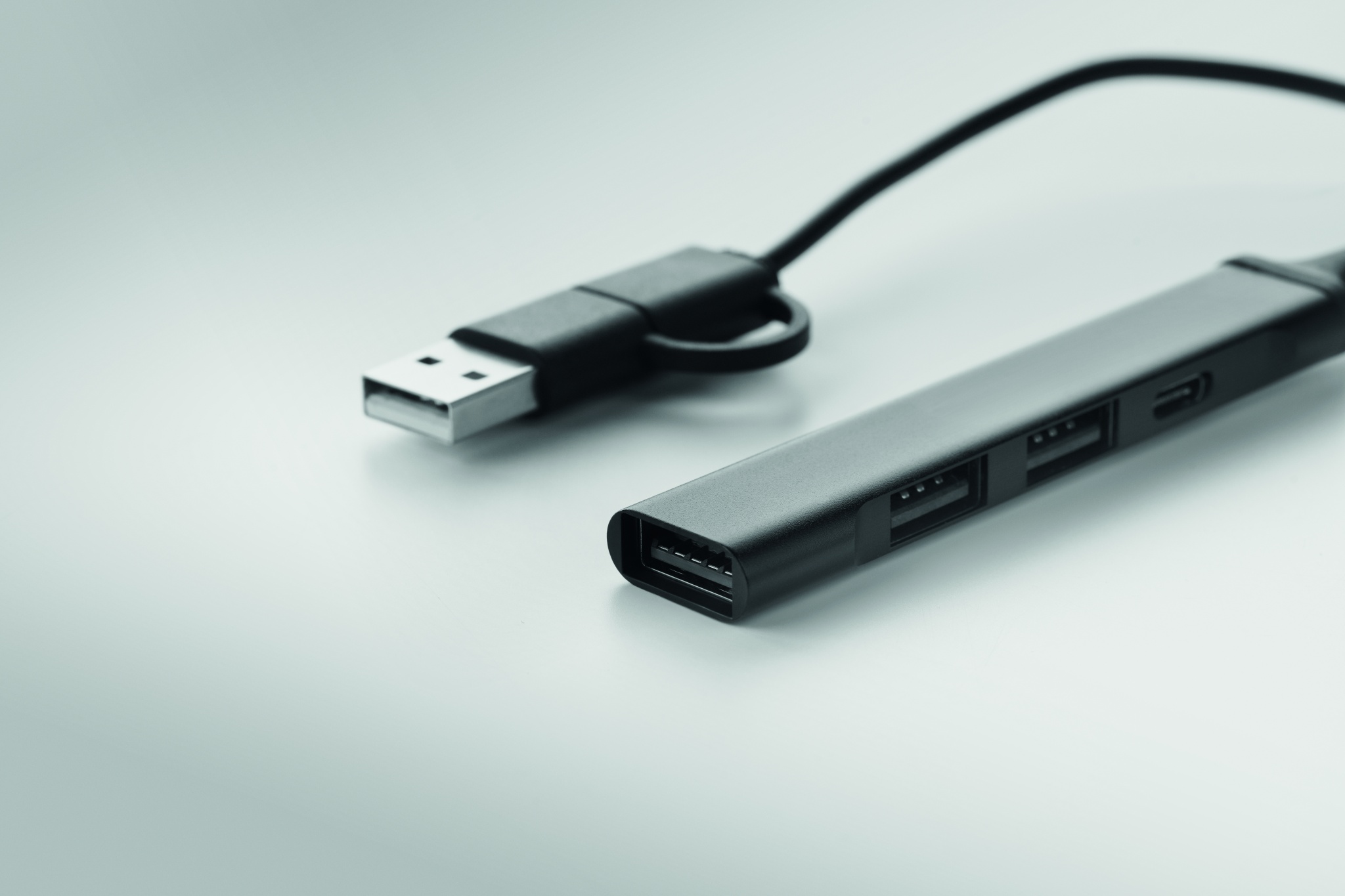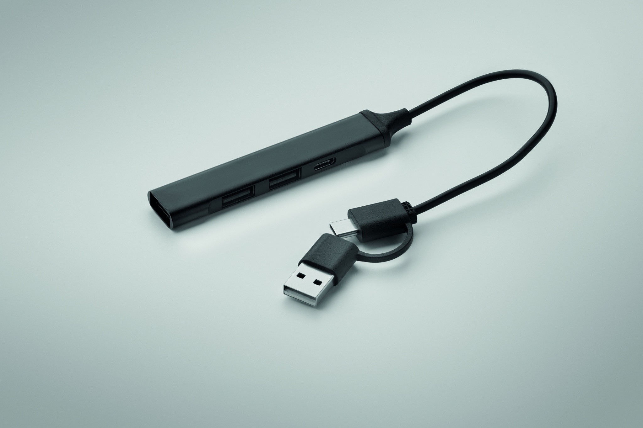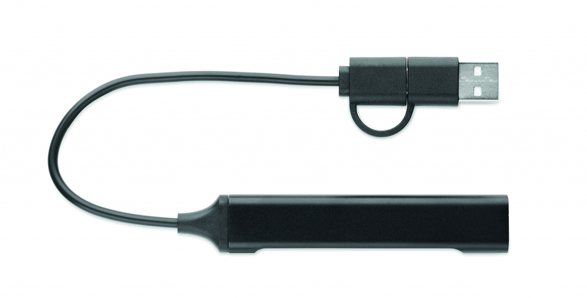 4 prievadų USB šakotuvas iš perdirbto aliuminio. 3 USB-A + 1 tipo C. Įvestis: du viename C ir A tipo. Kabelio ilgis: 19 cm.