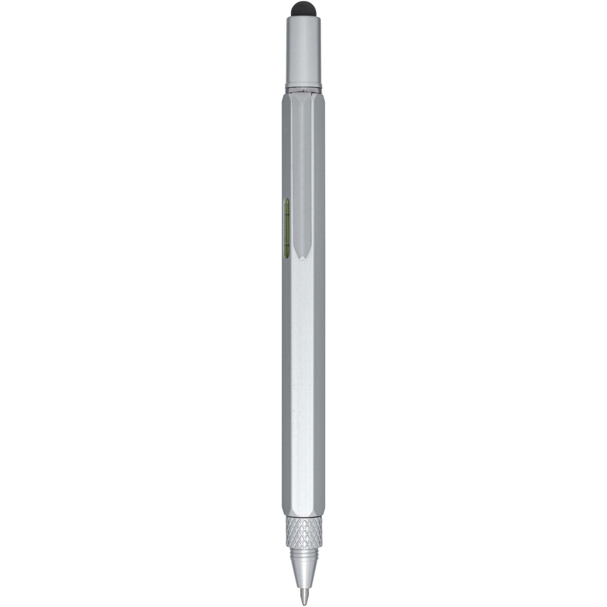 Dora alumīnija daudzfunkcionālā lodīšu pildspalva ir daļēji izgatavota no pārstrādātiem materiāliem, un tai ir abpusējs lineāls, svira, skrūvgriezis, gradients un melns irbulis no gumijas. Muca ir izgatavota no pārstrādāta alumīnija ar sudraba izsmidzināšanas pārklājumu. Klips ir izgatavots no dzelzs. Skrūvgriezis ir izgatavots no tērauda. Augšējā daļa un uzgalis ir izgatavoti no RABS. Tintes krāsa: melna. Rakstīšanas garums: 400 metri. Uzgaļa izmērs: 1,0 mm.