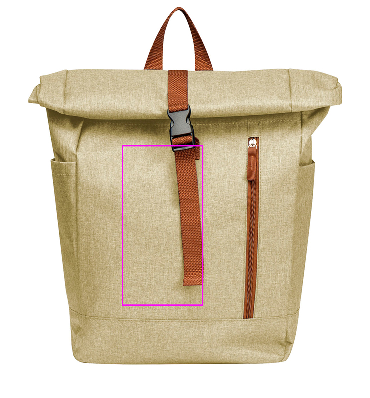 Mugursoma no 500D poliestera ar salokāmu vai rullējamu aizdari, polsterētām siksnām, pārnēsāšanas rokturi un slēdzamu priekšējo nodalījumu. Jūsu logotips tiks uzdrukāts uz priekšējā nodalījuma.