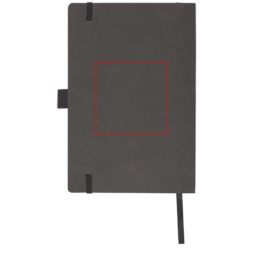 Мягкий на ощупь, гибкий блокнот (размер А5 для ориентации) со встроенной эластичной застежкой, закладкой, петелькой для ручки и кармашка для документов на внутреннем форзаце сзади. 80 листов кремовой линованой бумаги (80г/м2). Упакован в черную коробку-рукав.