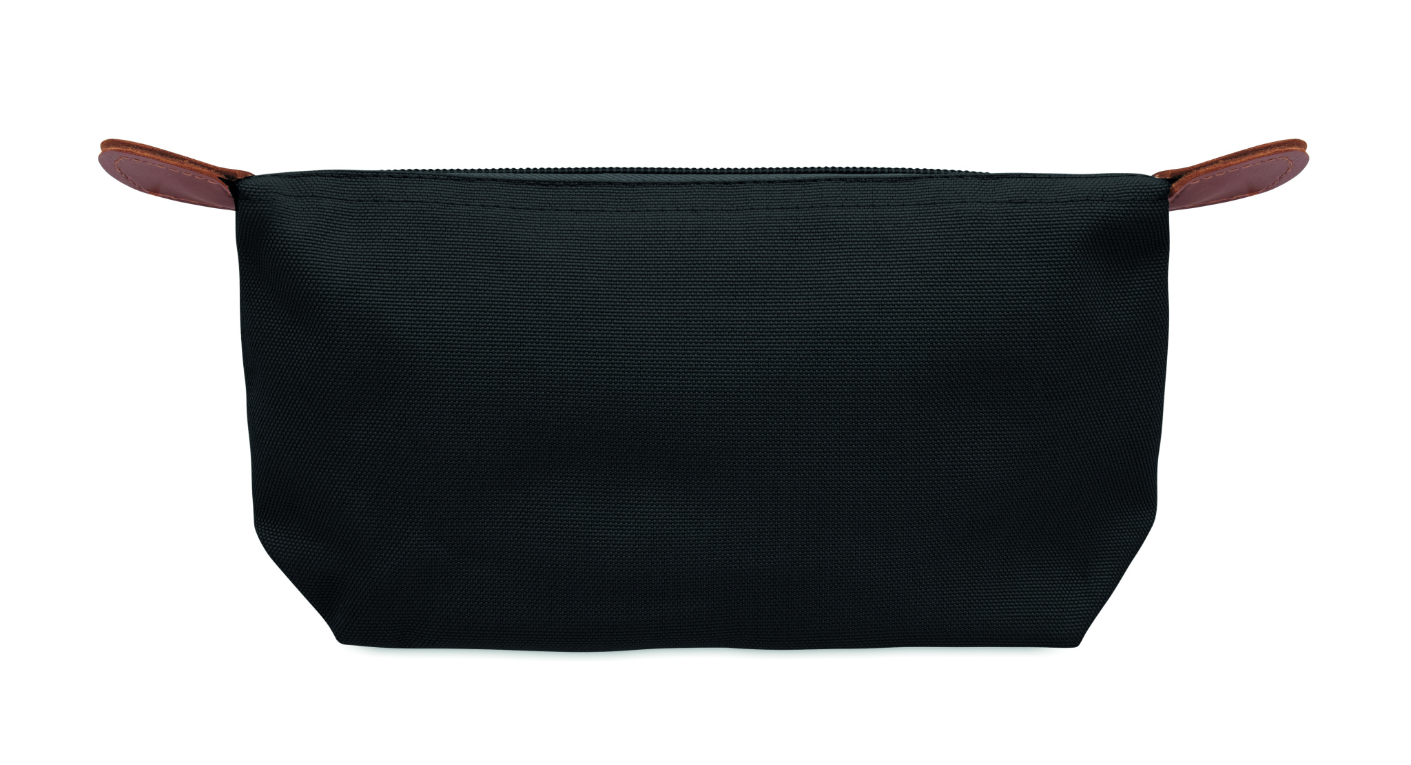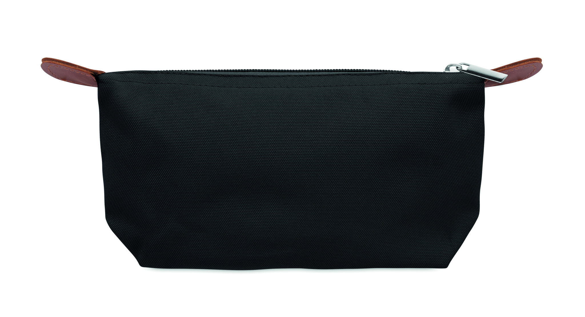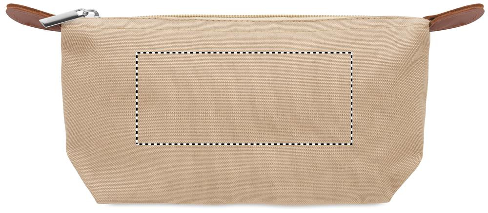 Cosmetic bag made of 600D RPET polyester with top zip closure and brown PU detail.