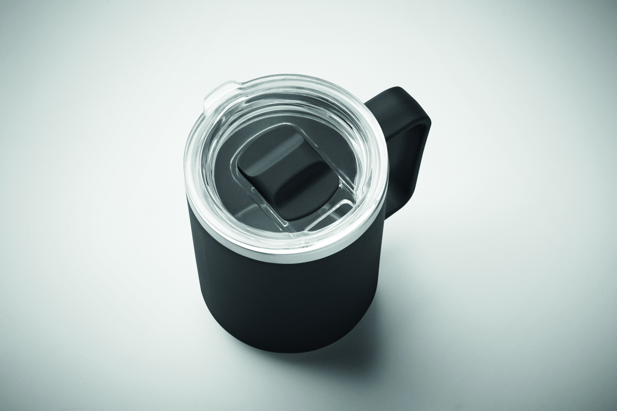 Double wall mug with 90 % recycled stainless steel and 10% stainless steel interior and recycled PP exterior. Includes transparent AS sliding lid. Capacity 400ml.