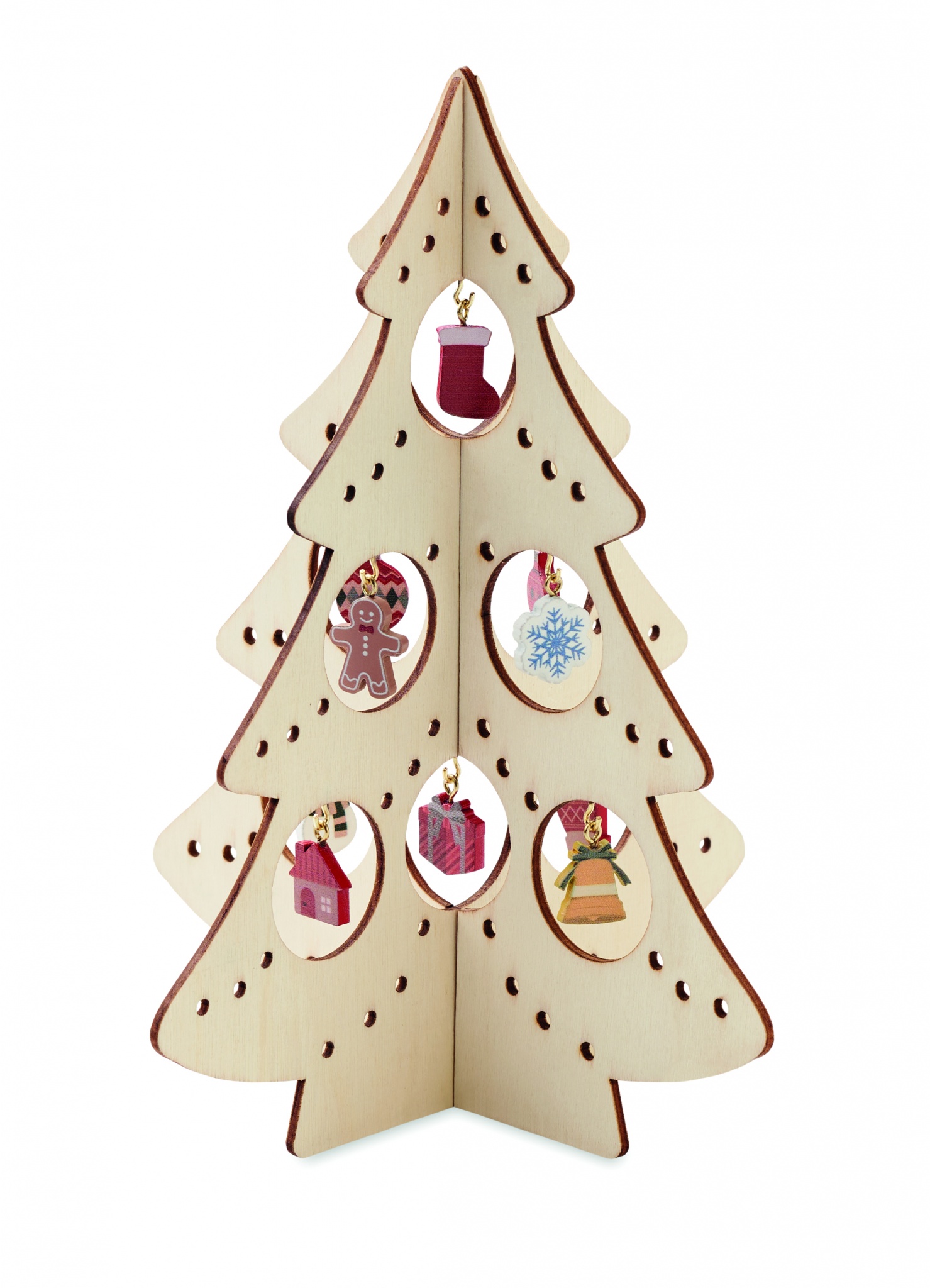 Фанерная силуэтная елка с 10 различными украшениями. Требуется сборка.