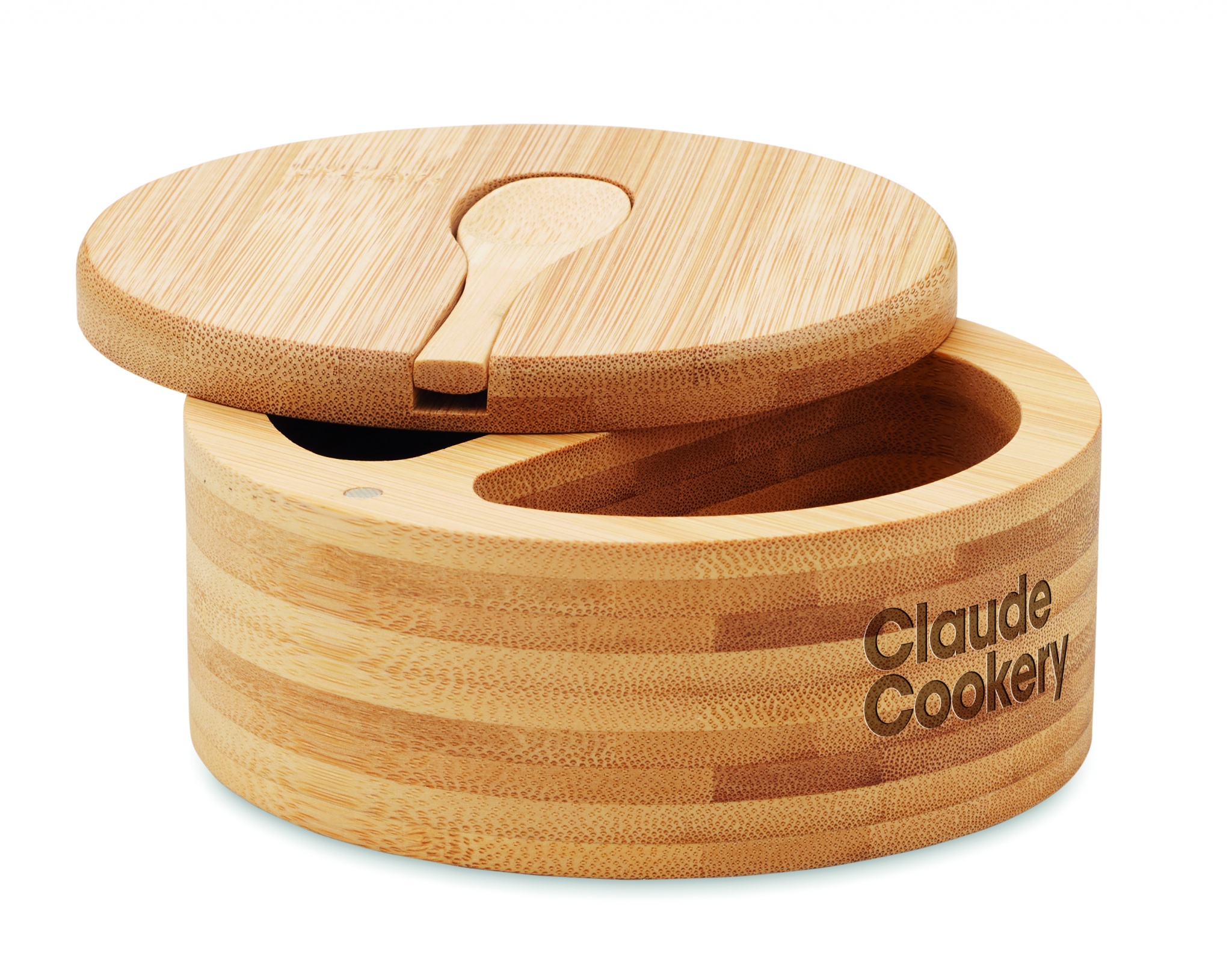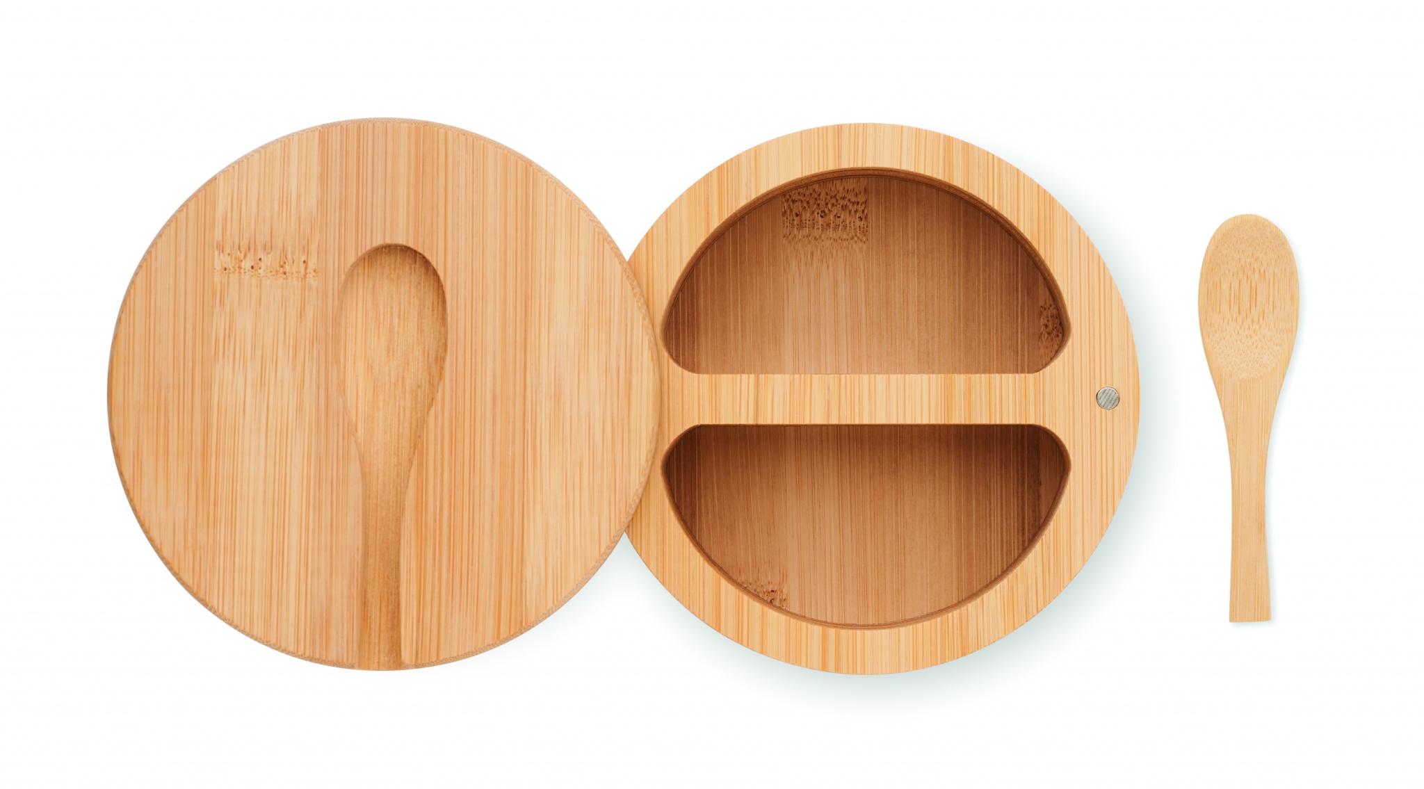 Солонка и перечница из бамбука со встроенной сервировочной ложкой. Два отделения. Съемная крышка.