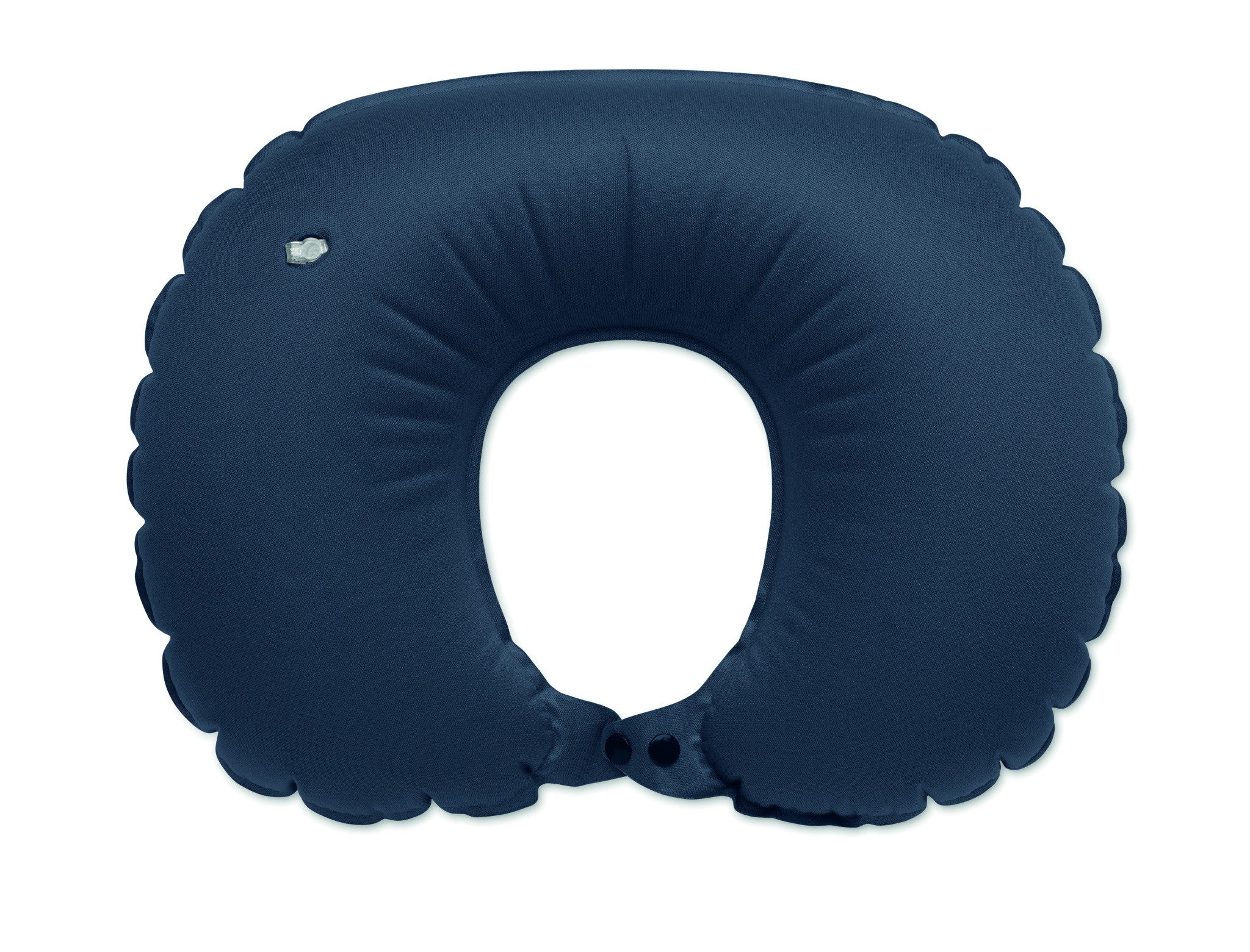 Fast inflatable pillow in milk silk fabric with built-in pump and release system. Pouch in self-material.