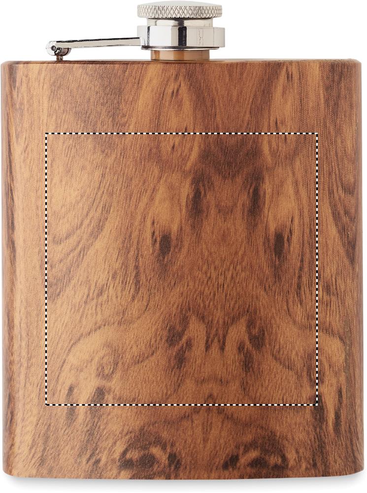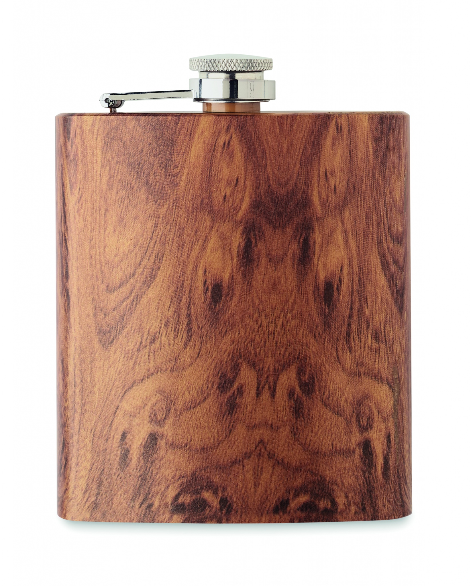 Тонкая набедренная фляга из переработанной нержавеющей стали (90% переработанной нержавеющей стали и 10% нержавеющей стали) с деревянной отделкой. Емкость 190 мл.