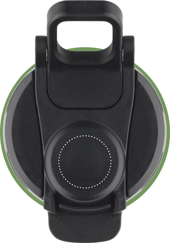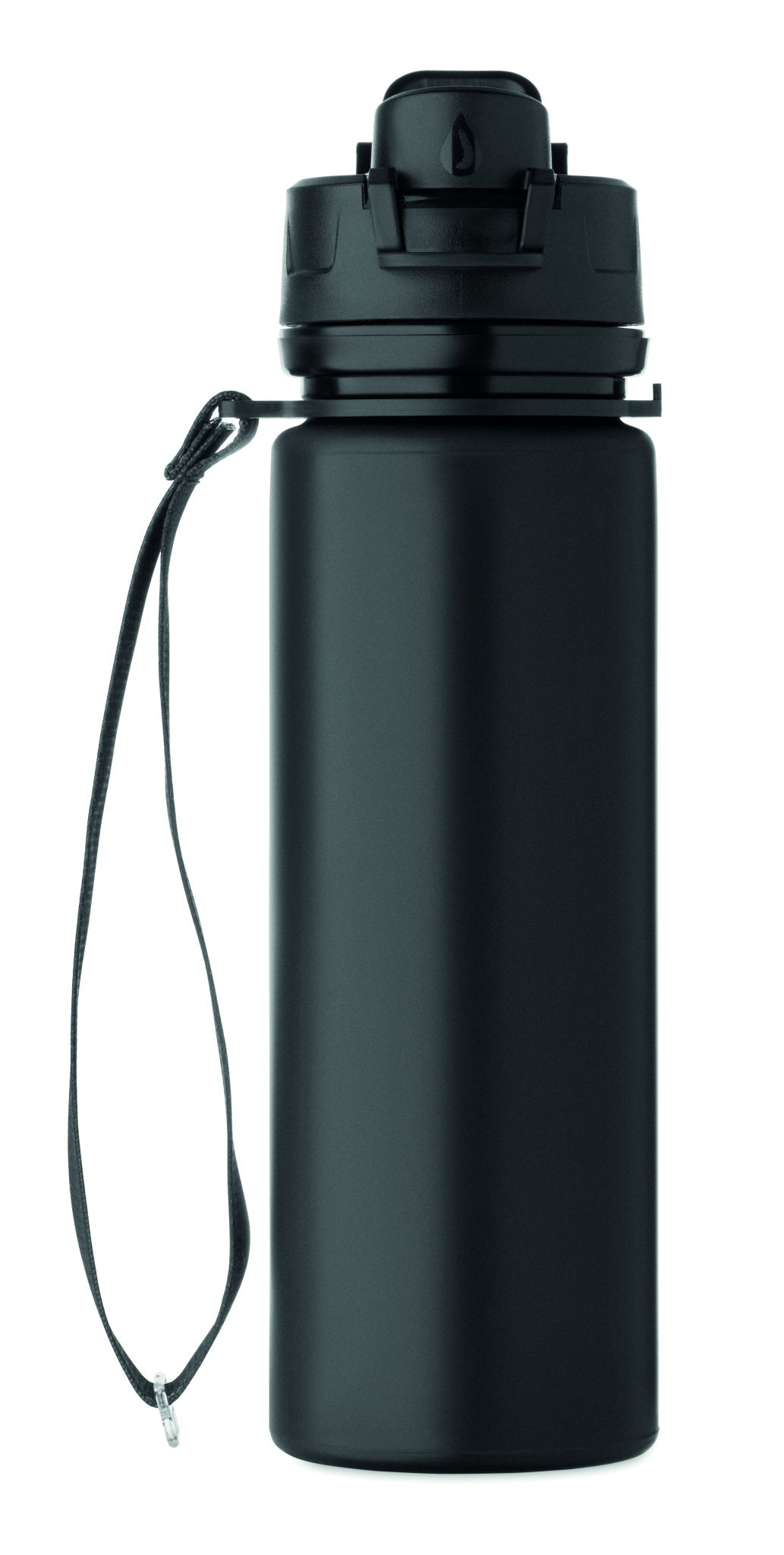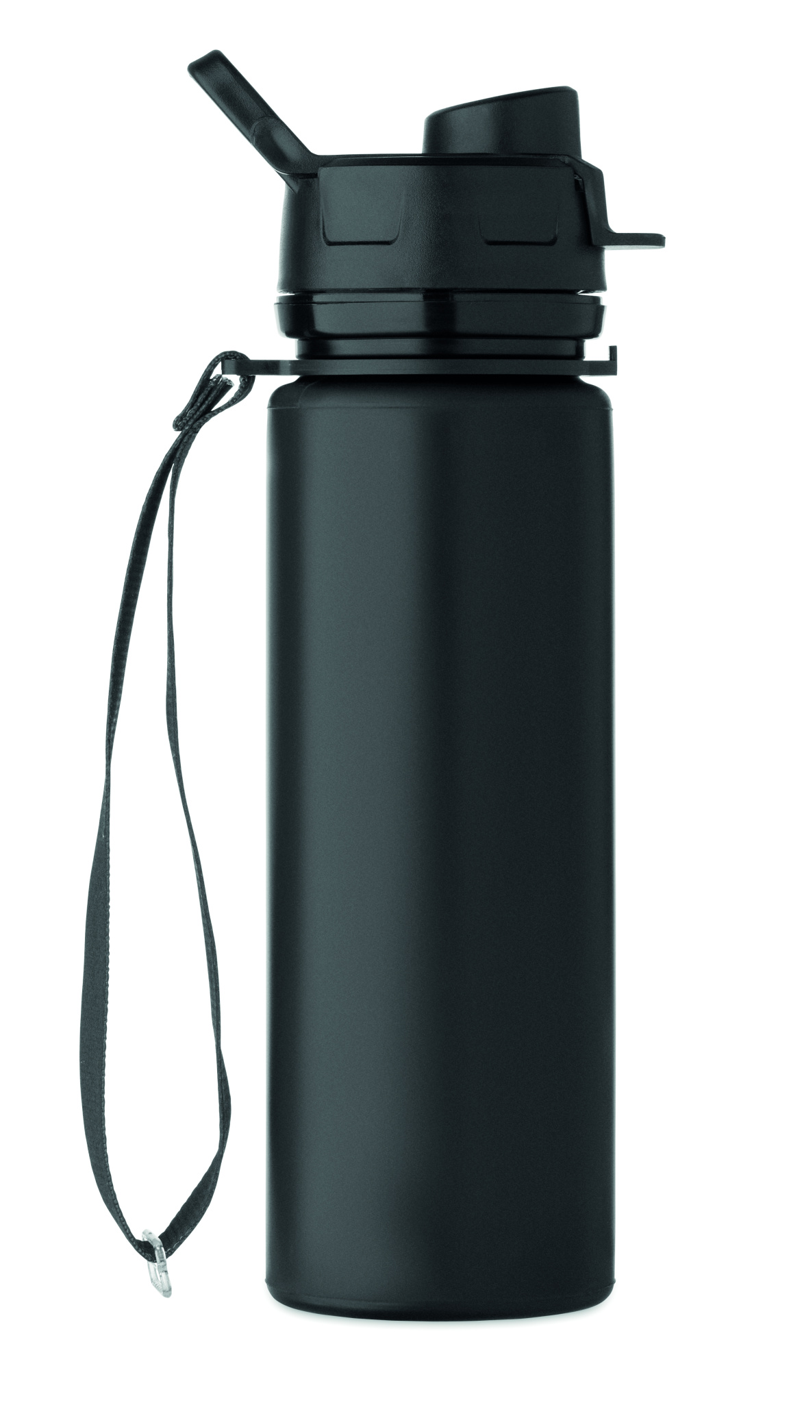 Foldable silicone sports bottle with PP lid, handle, polyester strap, and transparent buckle to secure when folded. Leak-free. Capacity: 500 ml.
