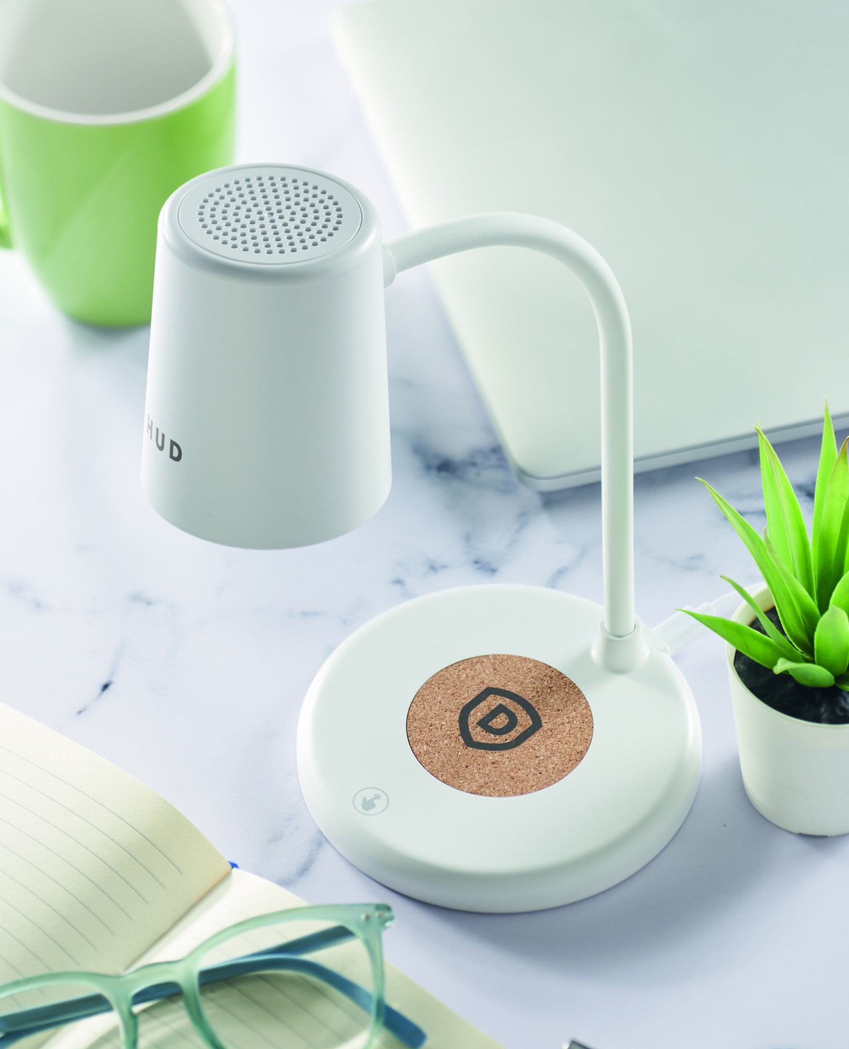 Настольная лампа с беспроводной зарядкой мощностью 15 Вт и беспроводной колонкой 5.1. Регулируемая интенсивность света с 3 режимами: дневной, холодный и естественный свет. Сенсорная кнопка включения/выключения. Выход: DC5V/1A (5 ВТ). Совместимость с последними моделями андроидов, iPhone® 12, X и более новыми.