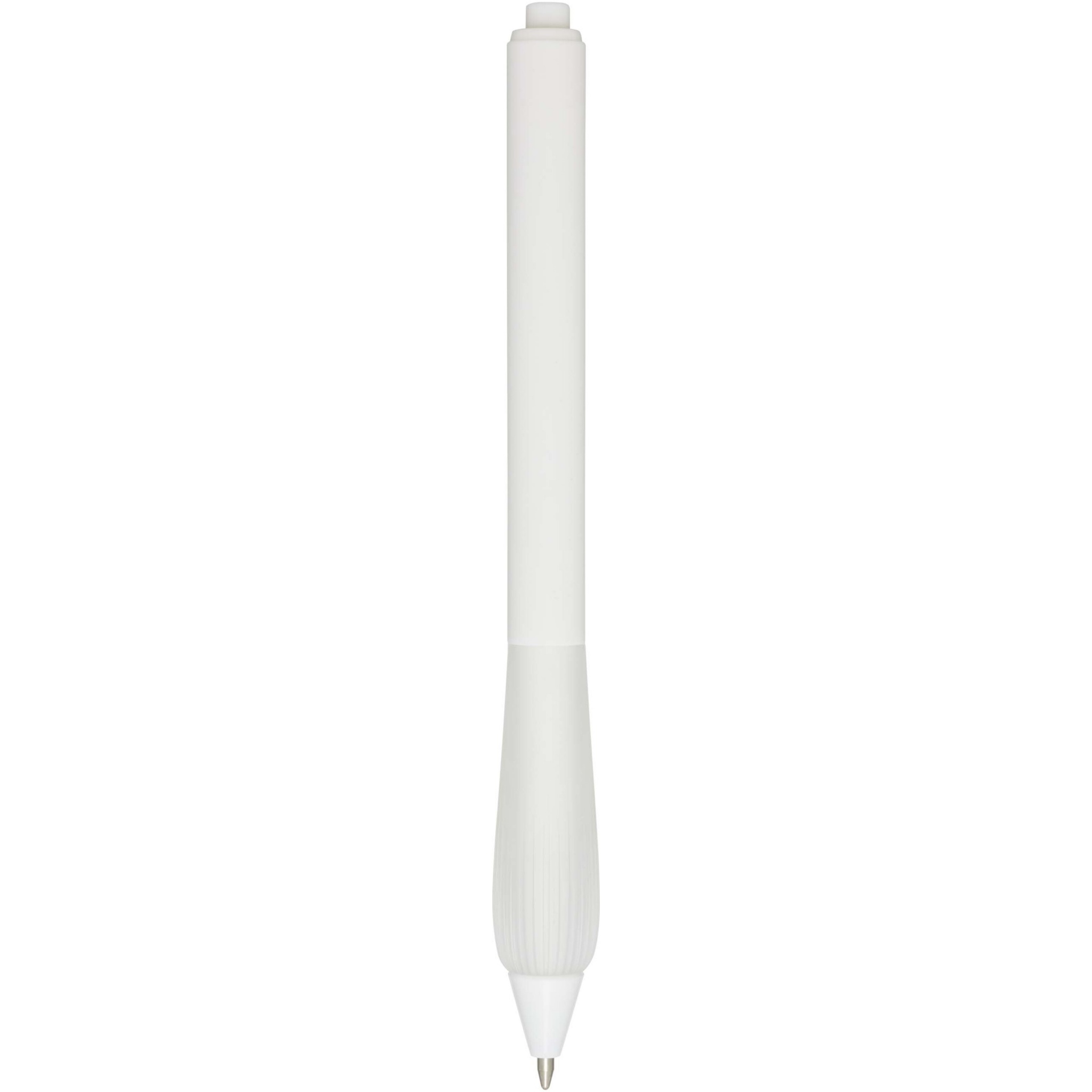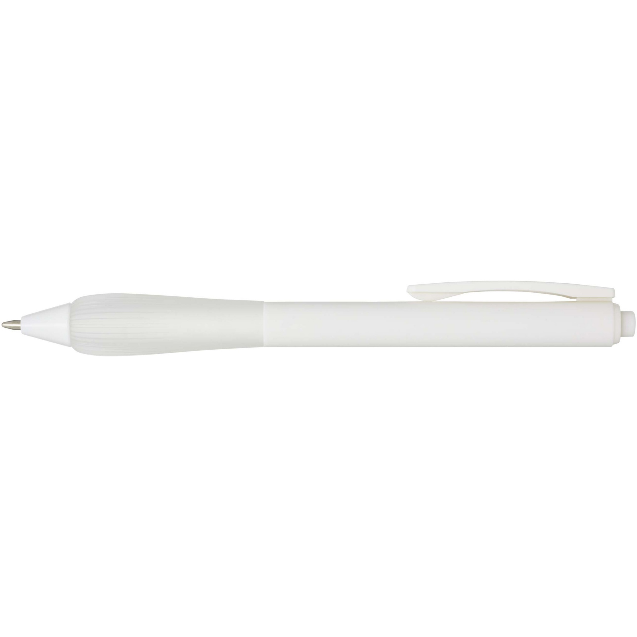 Шариковая ручка из переработанного пластика с прорезиненным корпусом и рукояткой из TPR. Цвет чернил: синий. Длина непрерывной линии: 1000 метров. Размер пера: 1,0 мм.