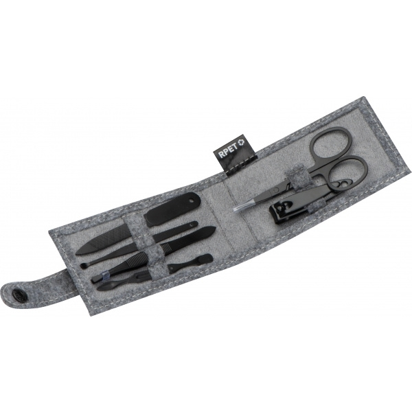 Привлекательный маникюрный набор из фетра (переработанный ПЭТ). Включает в себя ножницы для ногтей, пилочку, кусачки для ногтей, пинцет и два пушера для кутикул. Мы размещаем ваш логотип на передней части футляра.